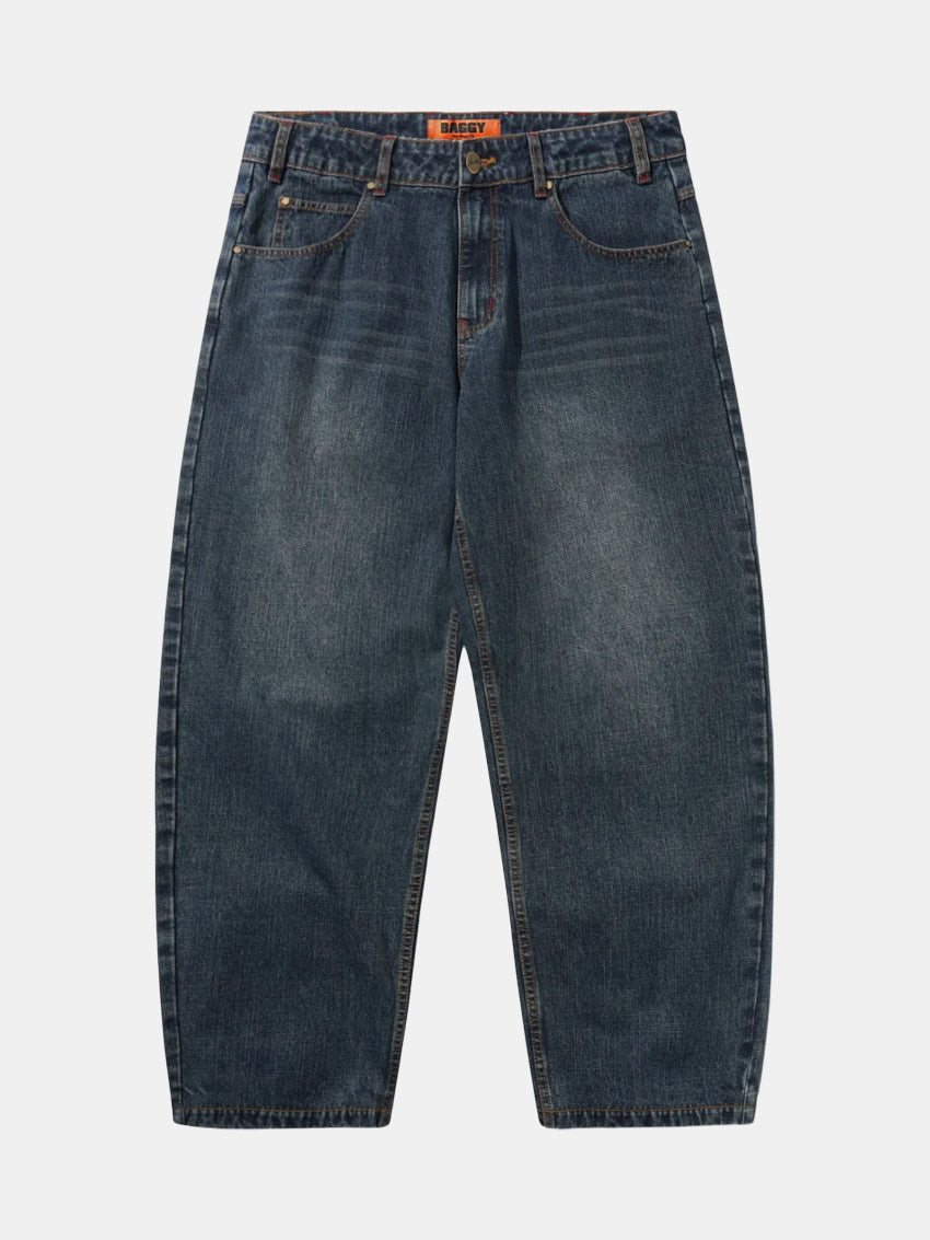 Mørkeblå jeans i bomuldsdenim med baggy fit og afslappet silhuet. Designet med påsyede baglommer med kædesyningsbroderi og PU-patch i linningen fra Butter Goods.
