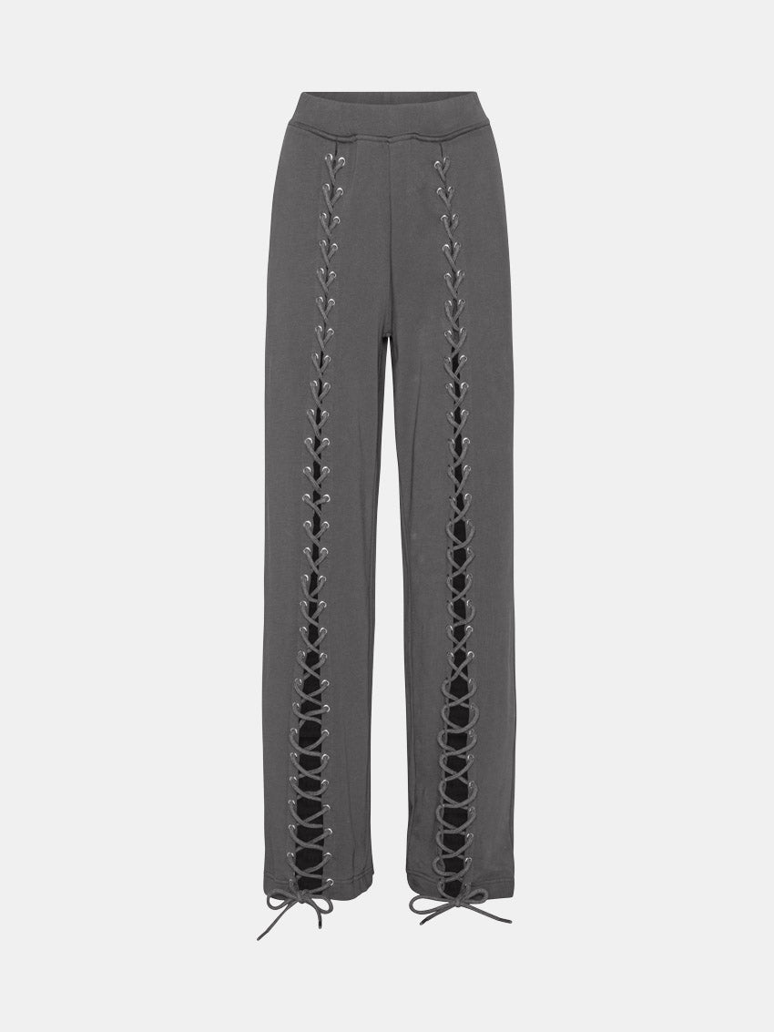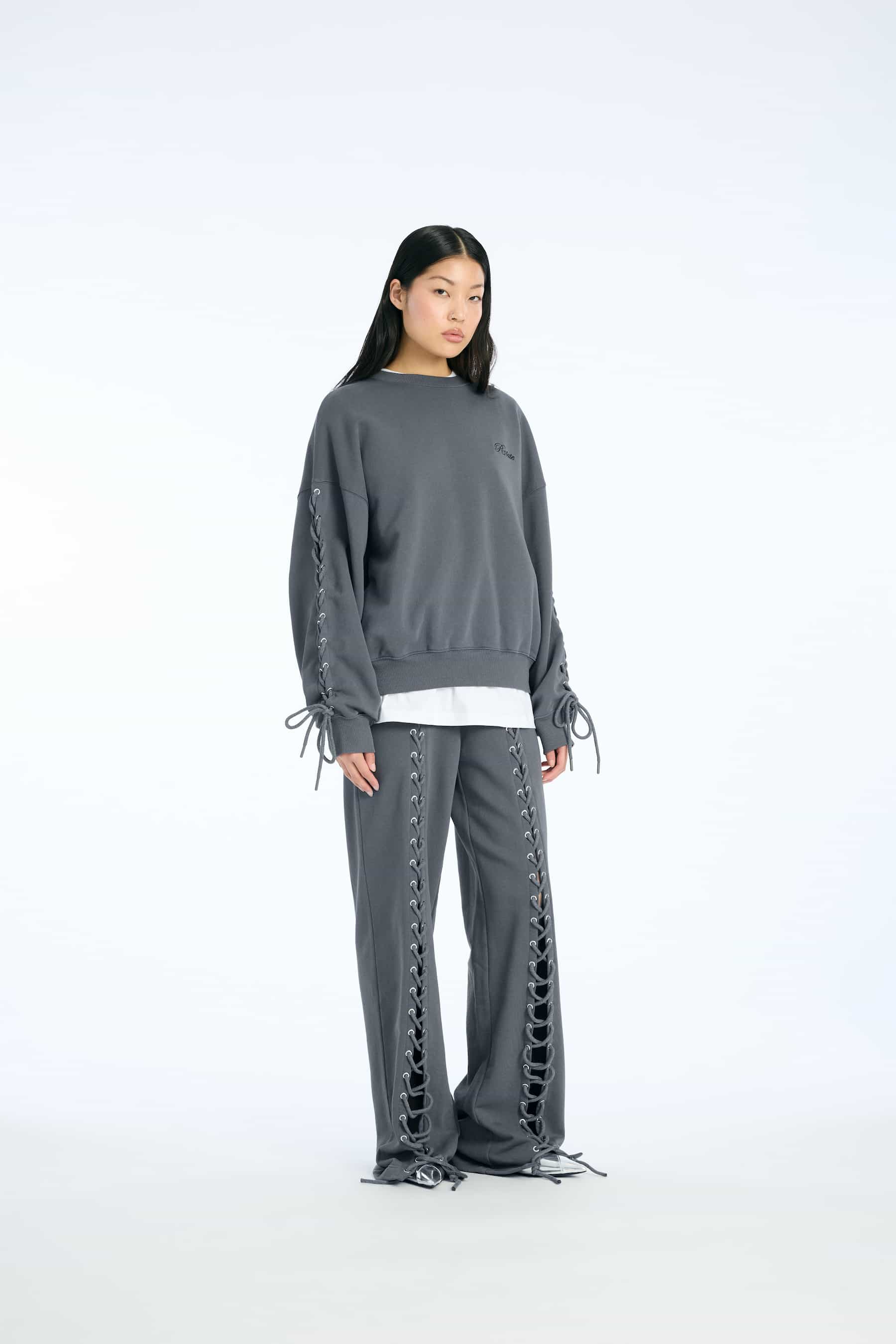 Løse sweatbukser i grå med cool snøredetaljer ned langs benene fra ROTATE.