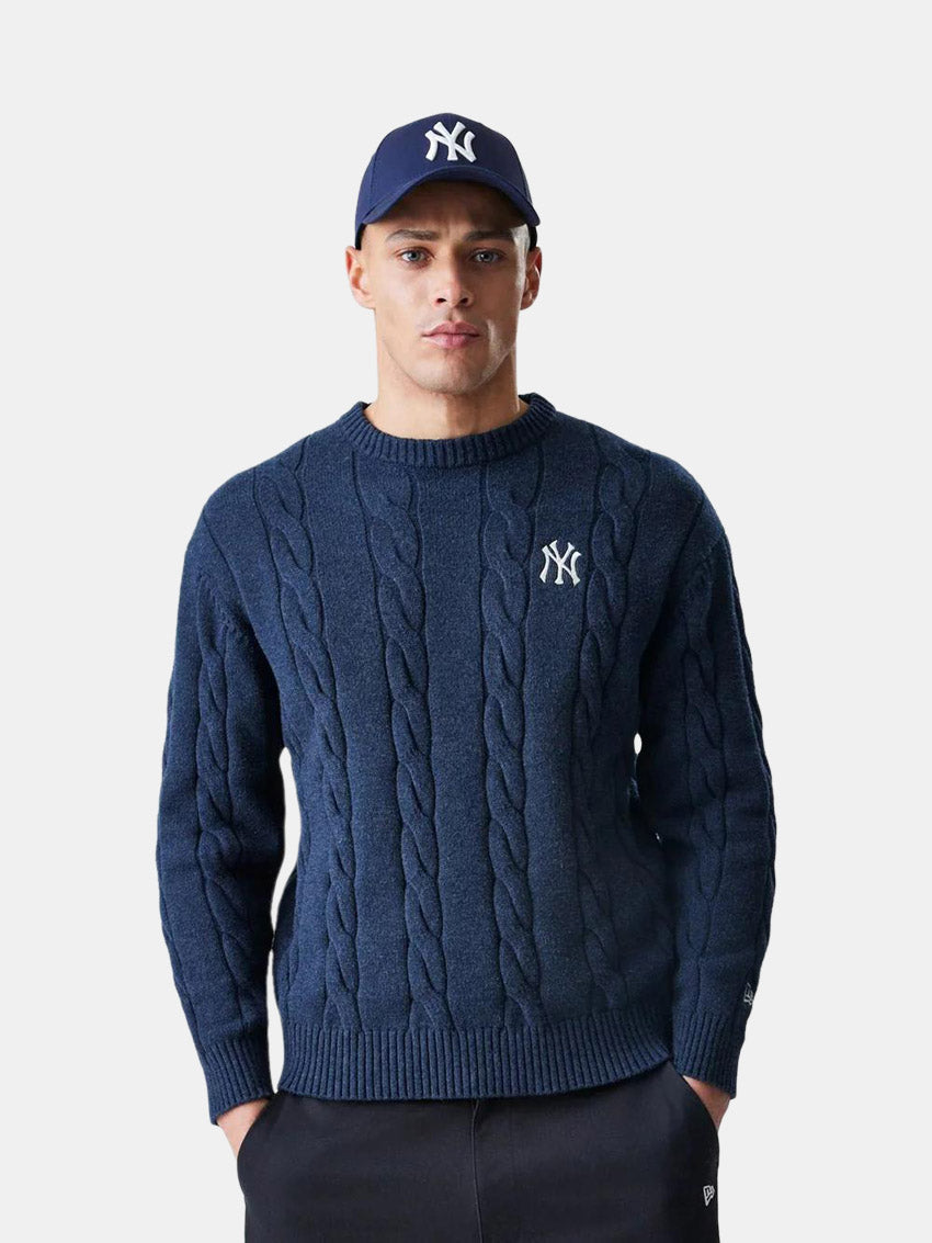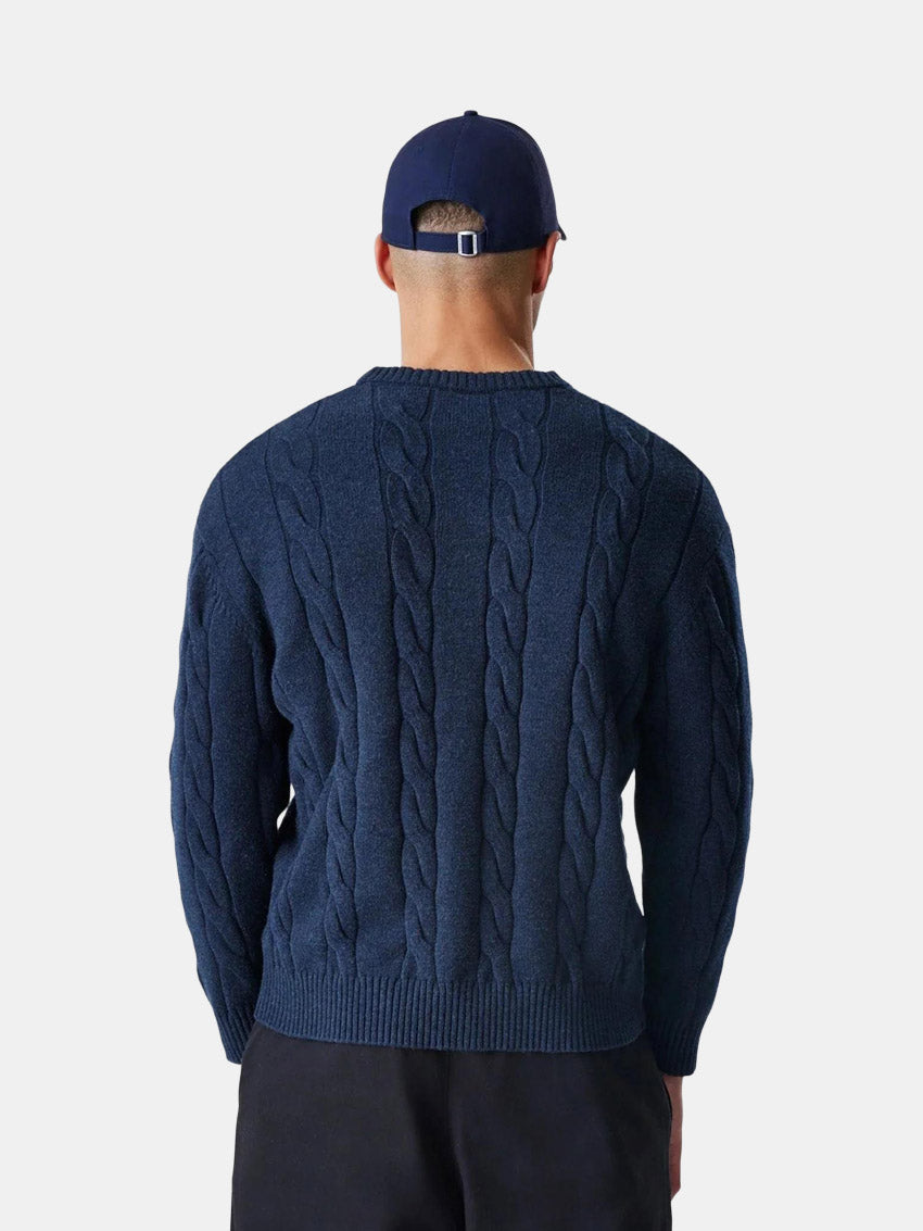 Mørkeblå kabelstrik med broderet logo på brystet fra New Era.