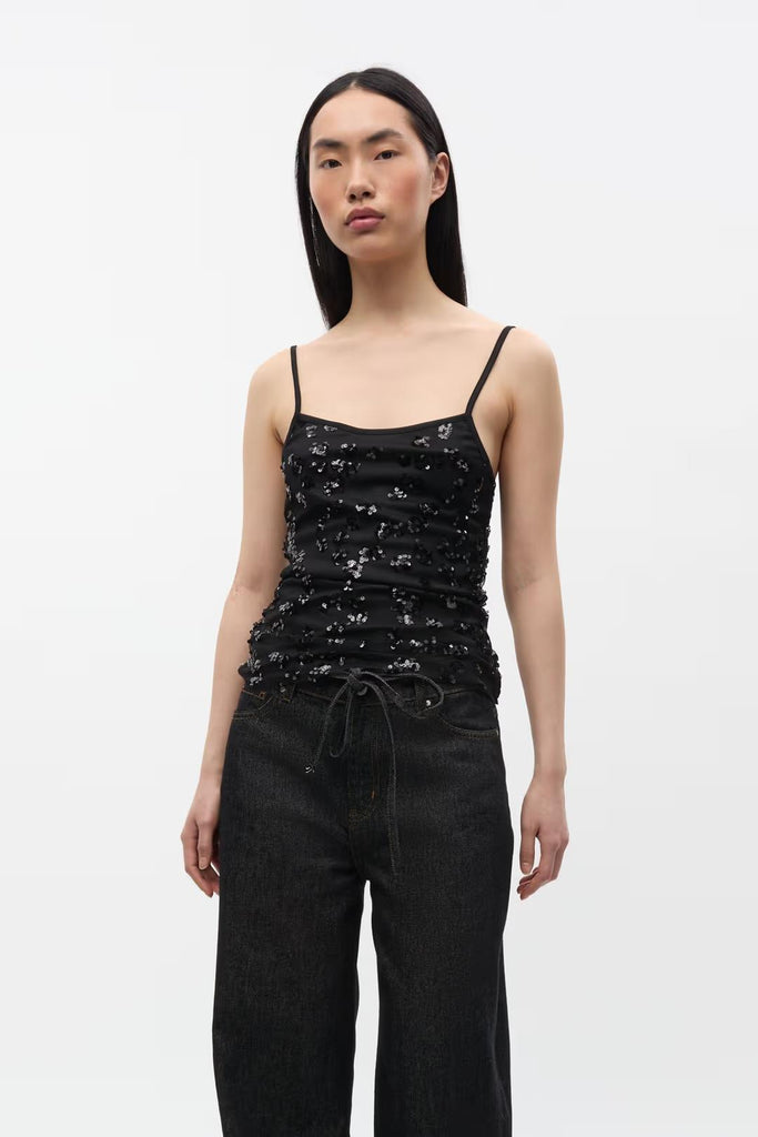 Tætsiddende top i sort med pailletter fra Envii.