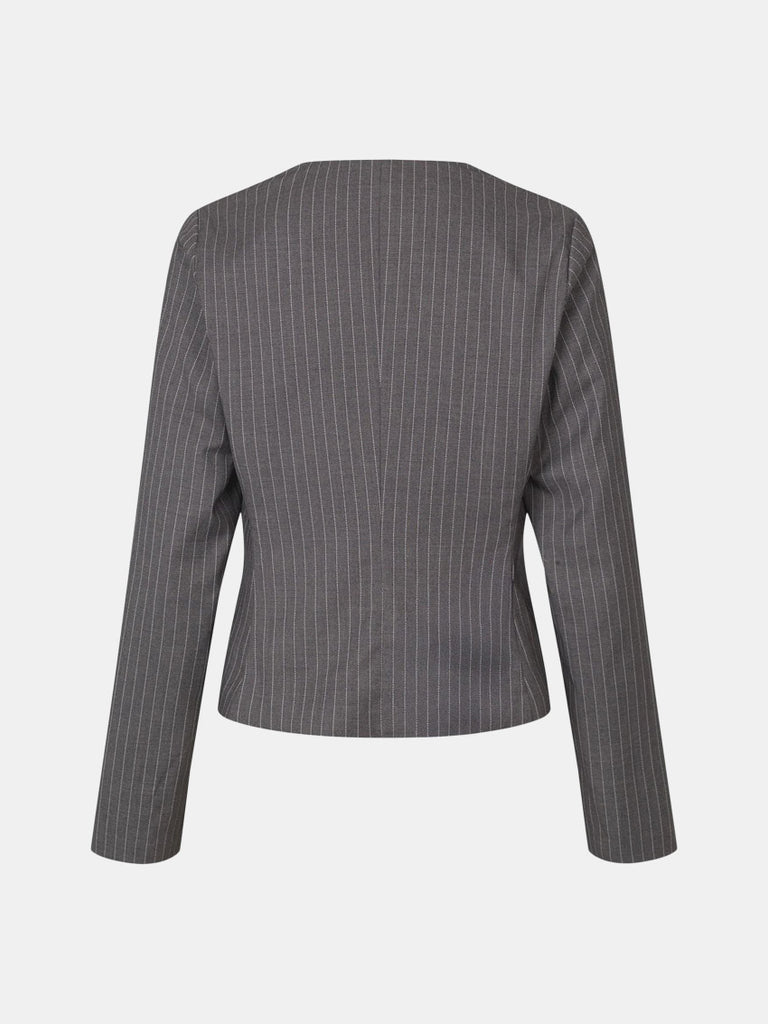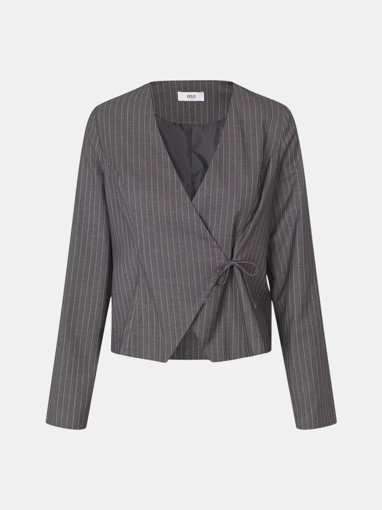 Mørkegrå bluse med nålestriber og bindebånd i siden fra Envii.