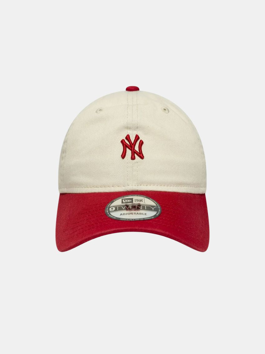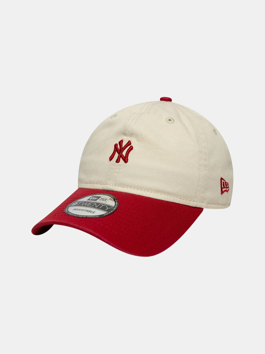 Light beige og rød cap med justerbar strapback fra New Era. Fronten prydes af mini Yankees-logo, venstre side har broderet New Era-flag, og cap’en har ustruktureret krone samt buet mørkebrun skygge med matchende