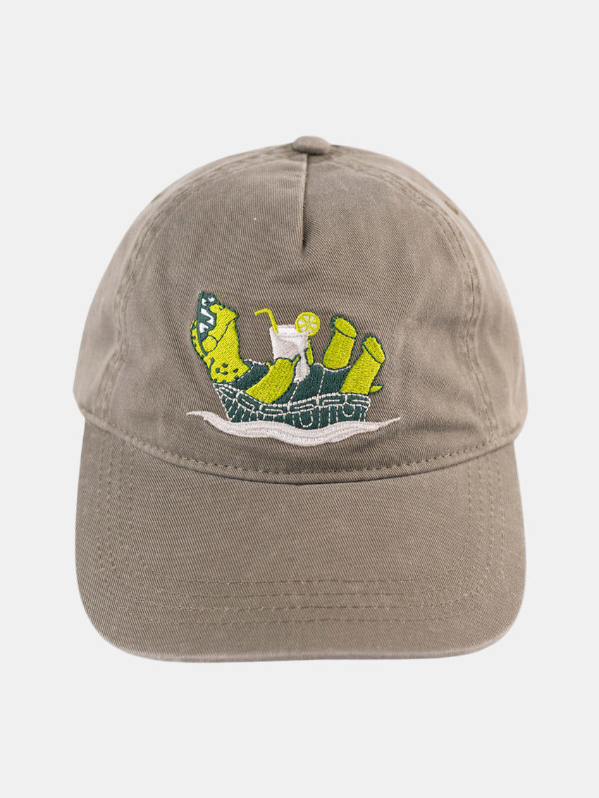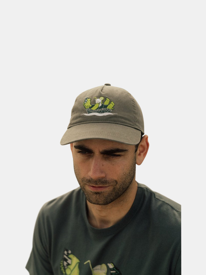 Grå kasket i økologisk bomuld med print foran af en skildpadde der slapper af fra Lakor.