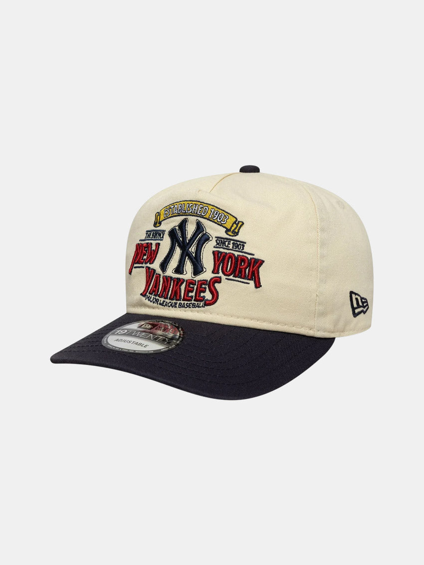 Light beige og navy cap med justerbar strapback fra New Era. Fronten prydes af Yankees-logo wordmark-grafik, venstre side har New Era-flagbroderi, og cap’en har ustruktureret krone samt buet navy skygge med matchende undervisor. Fremstillet i stof med washed-effekt for et afslappet, vintage-look.
