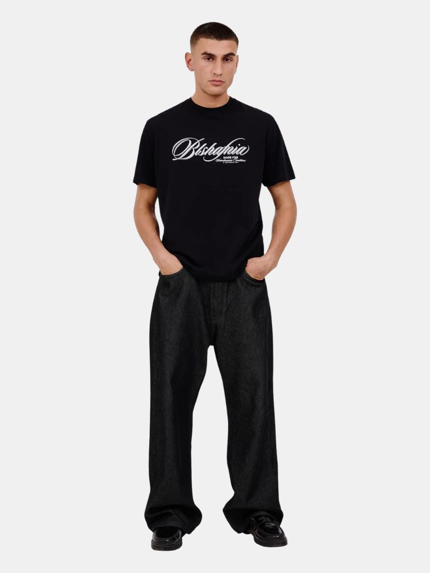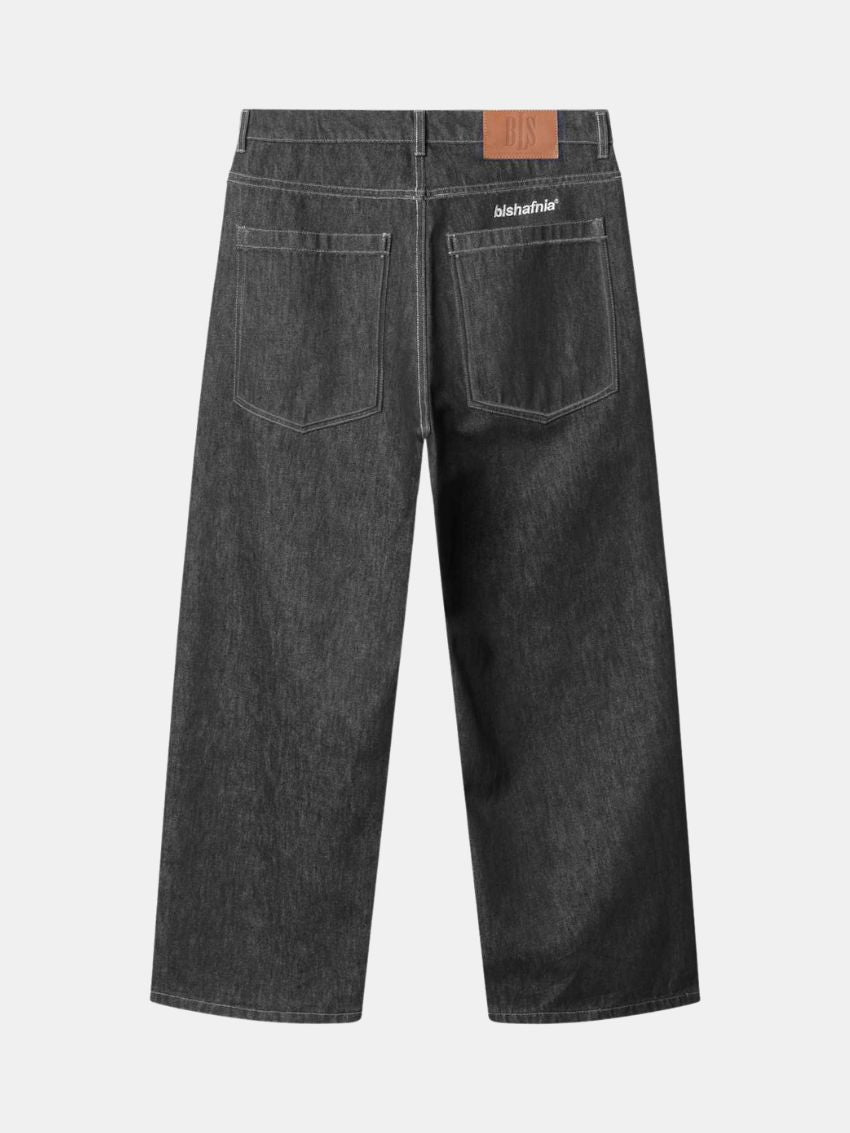 Jeans i sort denim fra BLS Hafnia. Buksrne er en hyldest til denimarv med et moderne streetwear-udtryk. Jeansene har en markant, ekstra bred silhuet, der giver masser af attitude og bevægelsesfrihed. Fremstillet i premium økologisk bomuldsdenim og produceret i EU. Designet er kendetegnet ved kontrastsyninger, et rent baglomme-design, signatur BLSHafnia®-broderi over højre baglomme samt en custom BLS-læderpatch i taljen. Et moderne essential med klare referencer til klassisk workwear.