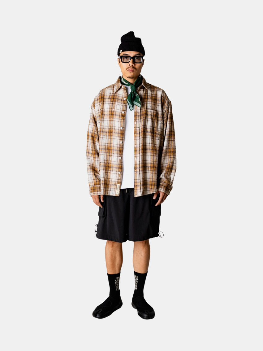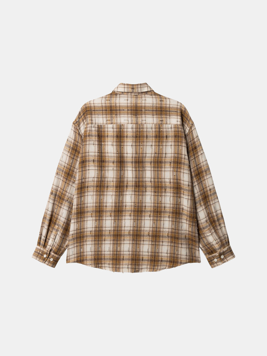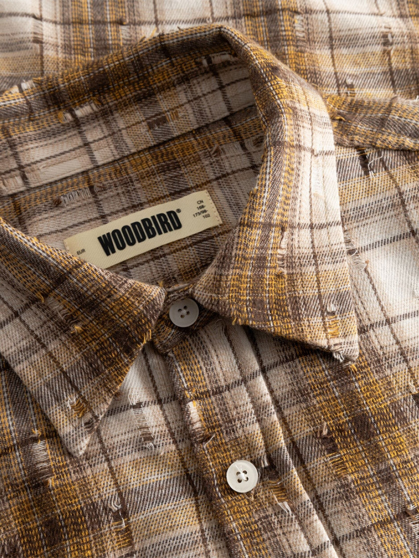 Brun langærmet, ternet skjorte med falmet look, diskrete slidte detaljer og afslappet pasform fra Woodbird.