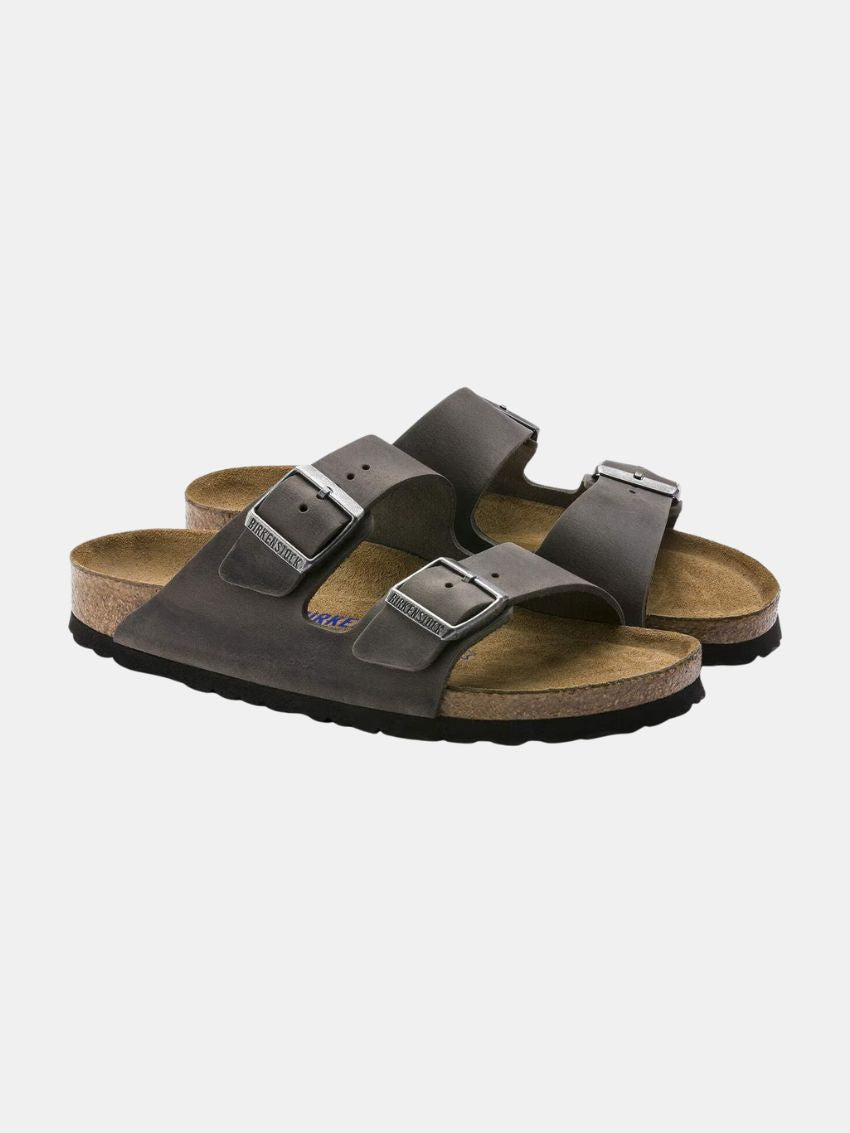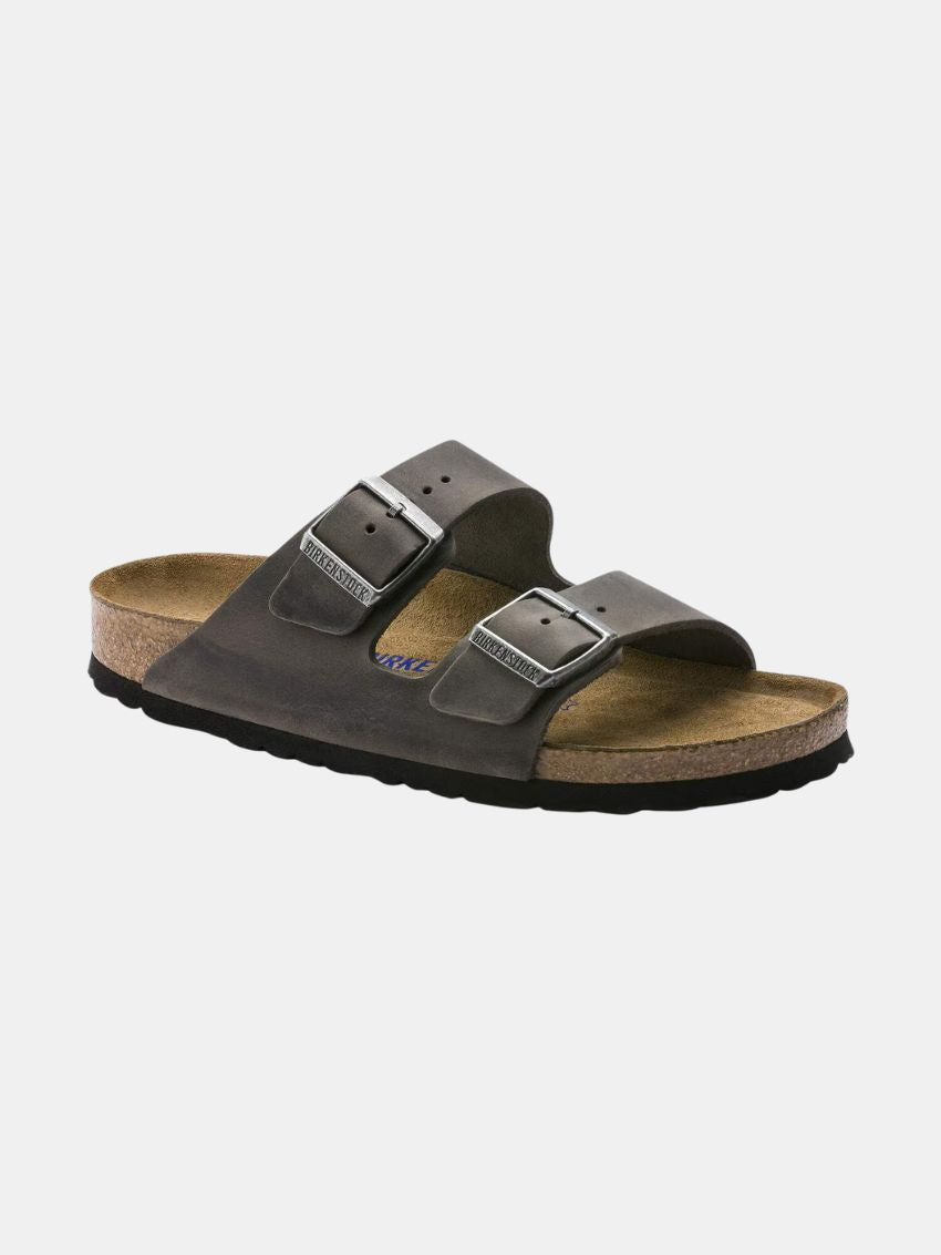 De klassiske Arizona slippers i farven Iron med regular vidde og blød fodseng fra Birkenstock.
