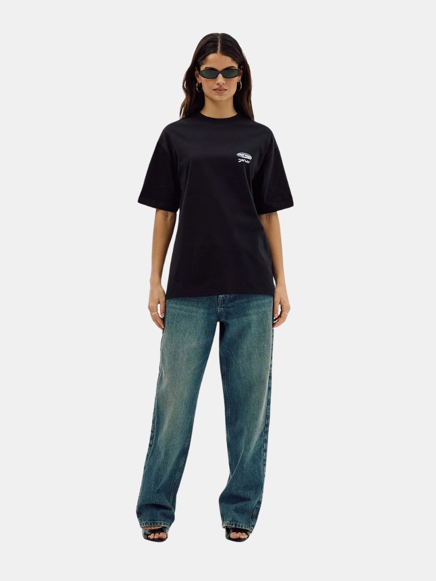T-shirten har et oversized fit, men størrelserne er “normale” – så bruger du normalt str. L, skal du også vælge L her.