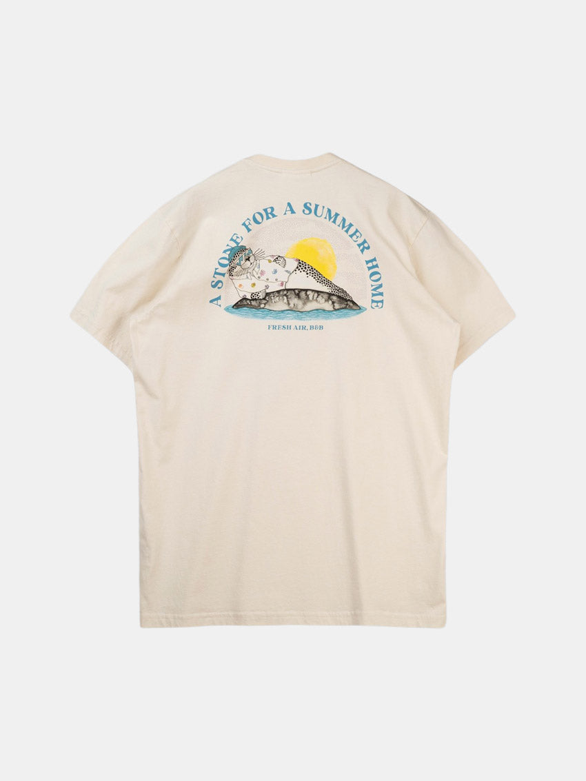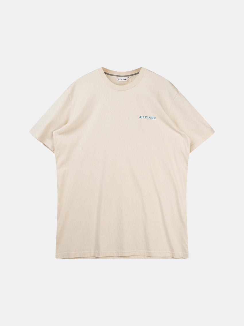 Beige t-shirt i økologisk bomuld med print på brystet og ryggen fra Lakor.