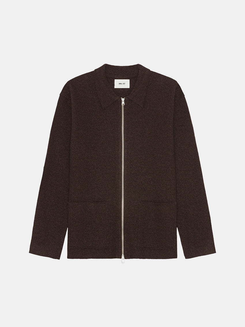 Brun hybridjakke i kogt merinould med blød, let tekstur, rå kantdetaljer og gennemgående lynlås fra NN07.