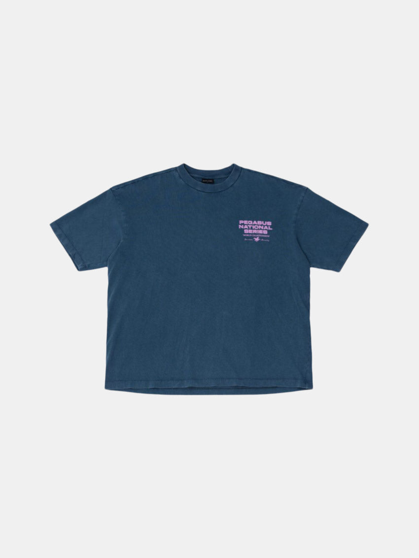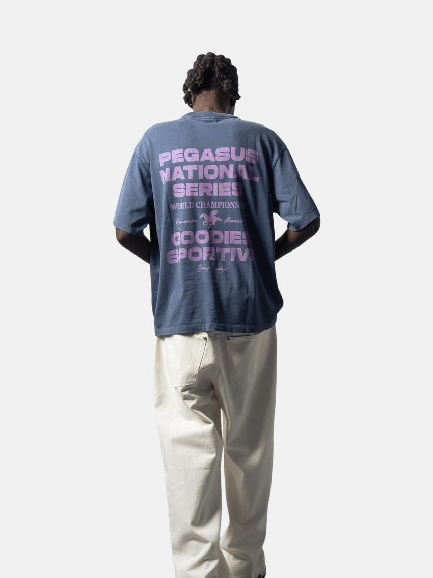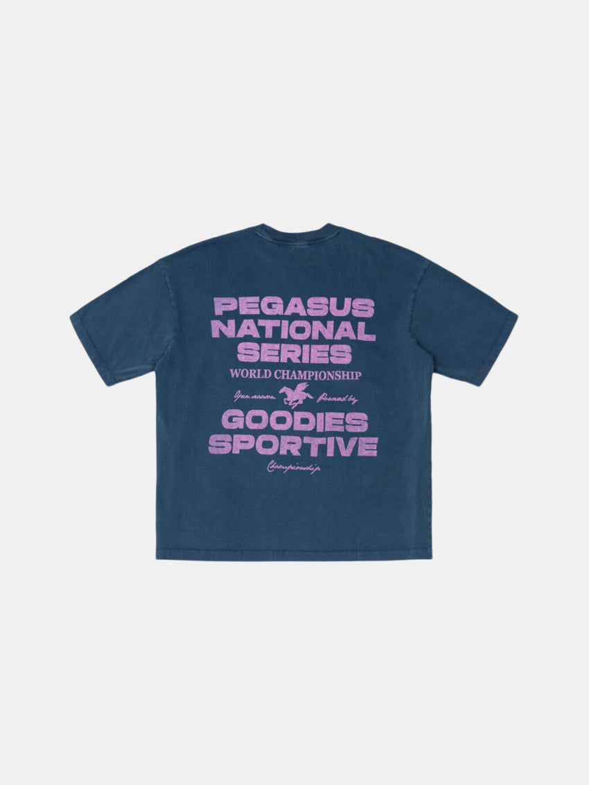Pegasus Series Blue Tee er en klassisk t-shirt i dyb blå med grafisk print på venstre bryst og ryg fra Goodies Sportive. Designet kombinerer sporty detaljer med rene linjer og en afslappet pasform, der gør den let at style i enhver garderobe.