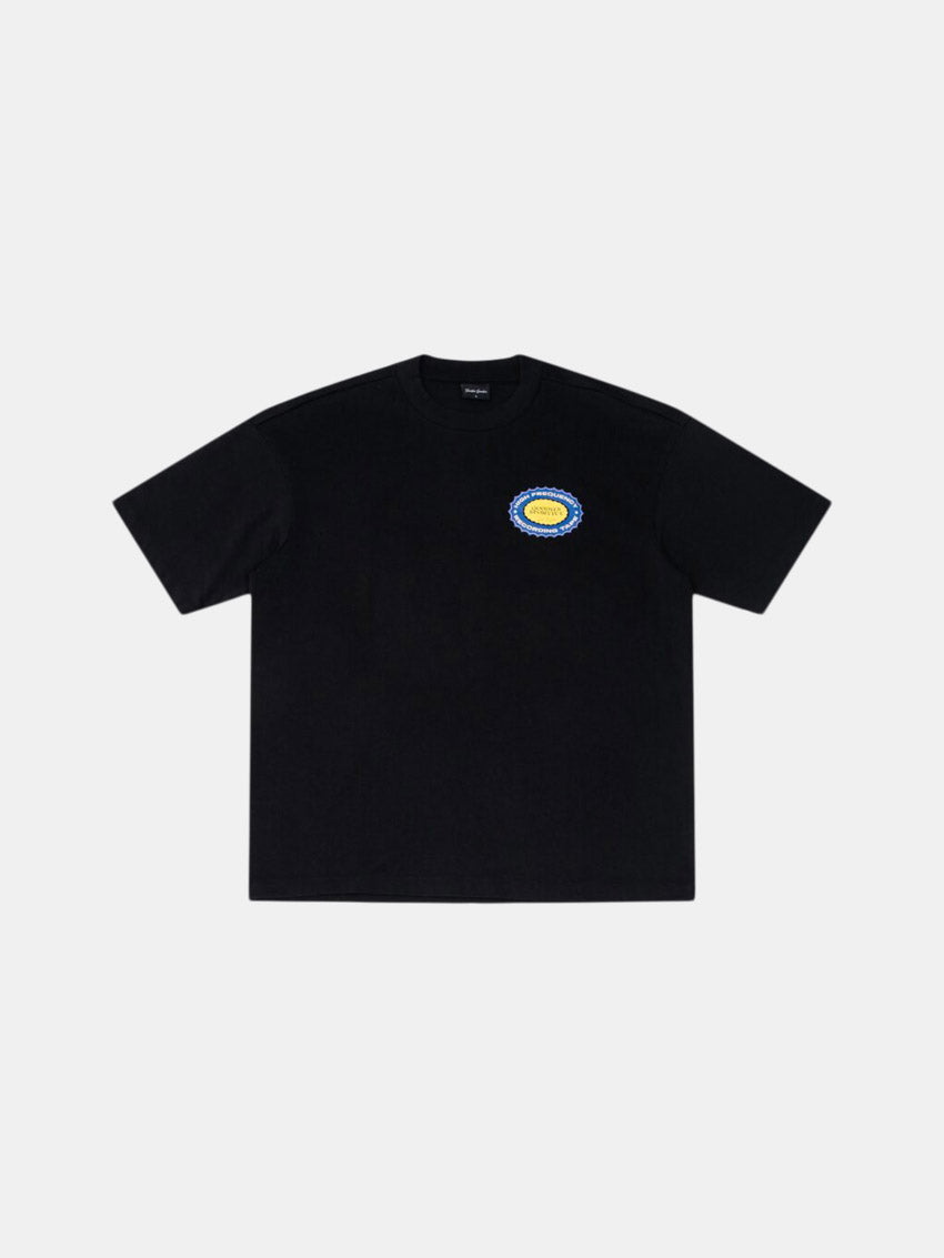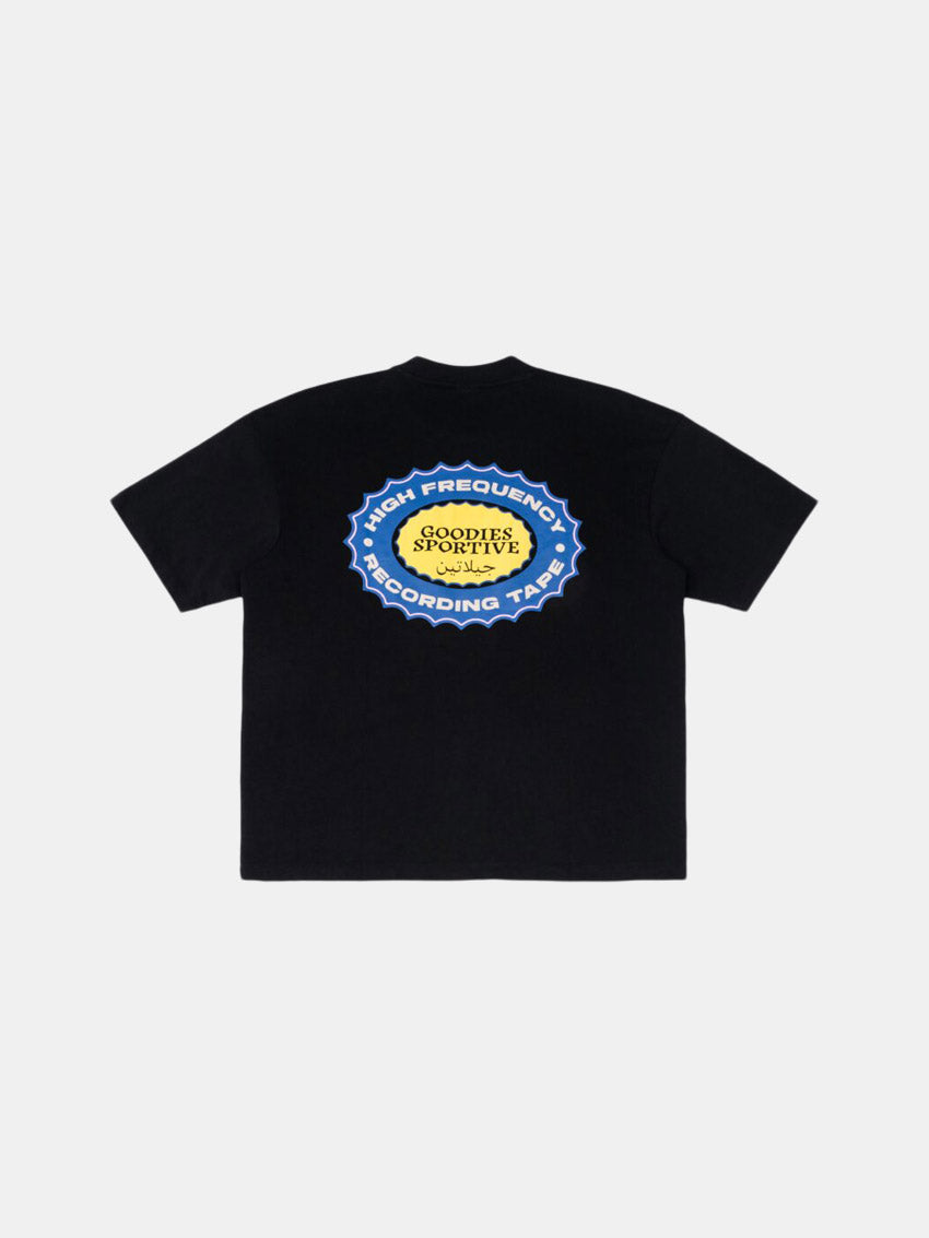 Recording Tape Tee i sort med print på venstre bryst og midt på ryggen fra Goodies Sportive. T-shirten har rund hals, er fremstillet i 100% bomuld og produceret i Portugal.