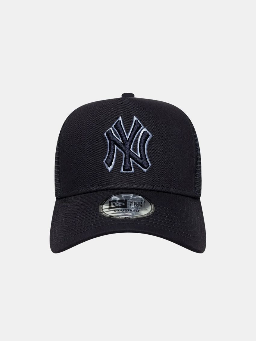 Navy Trucker cap med justerbar snapback fra New Era. Fronten prydes af Yankees-logo, venstre side har New Era-flagbroderi, og cap’en har struktureret E-Frame-krone, buet skygge samt mesh på ryg og sider for ventilation.
