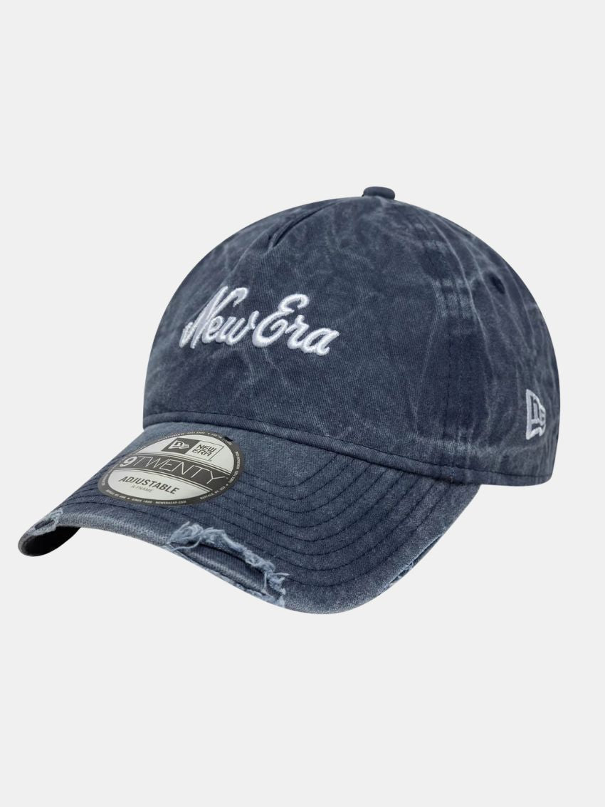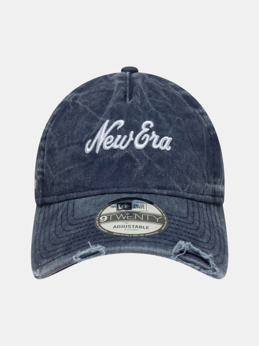 Navy cap med justerbar strapback. Fronten har Heritage Script-logo, højre side er broderet med “Established 1920”, og venstre side prydes af New Era-flaget. Den ustrukturerede A-Frame-krone og den buede, distressed skygge giver et afslappet, vintage-inspireret udtryk. Underskyggen er sort.