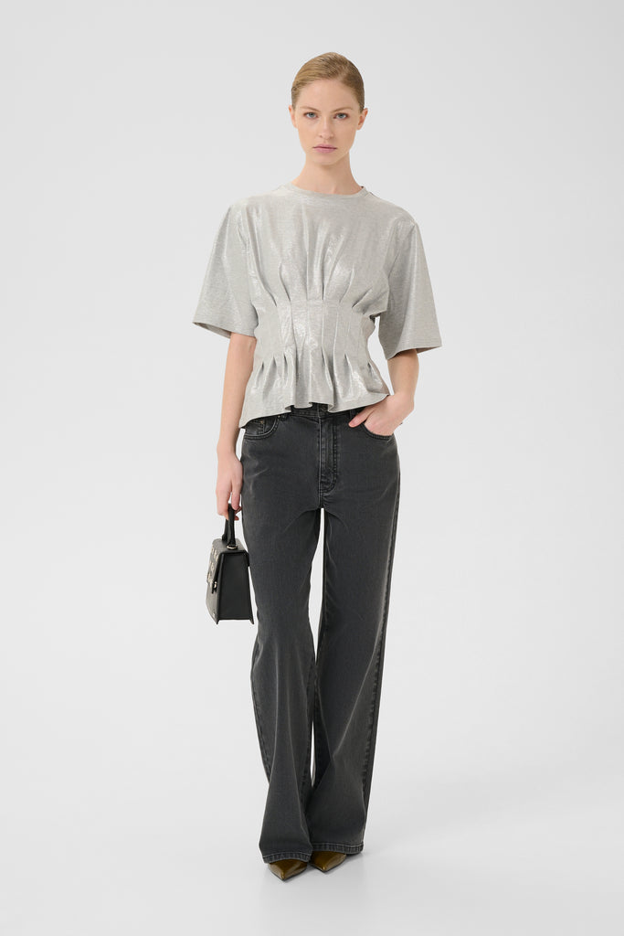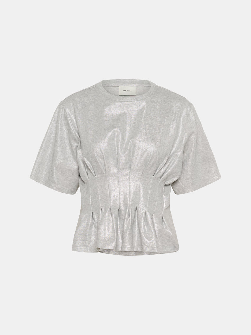 Cool sølv t-shirt med strukturerede syninger, der går ind i taljen fra Gestuz.