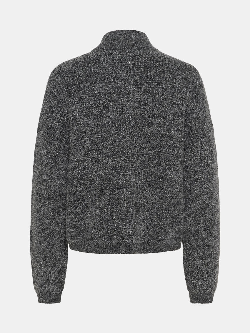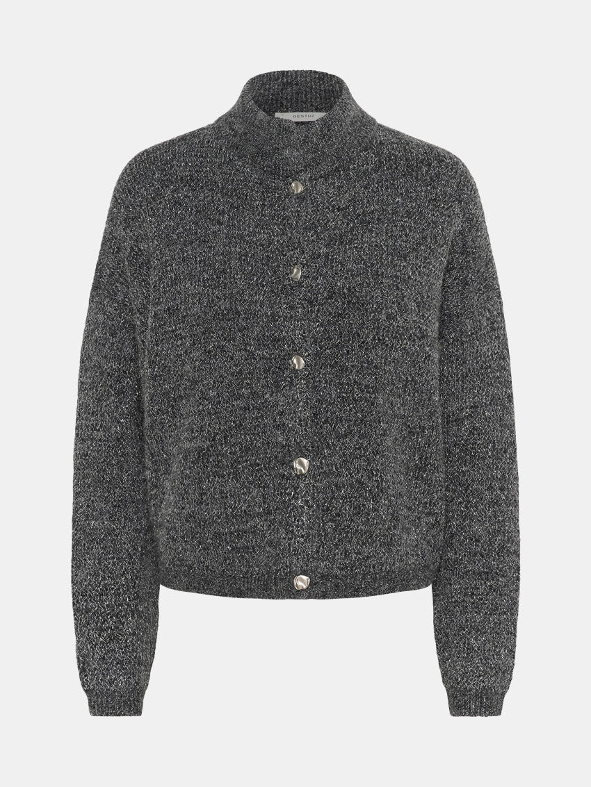Grå strikket cardigan med glimmertråde. Designet med høj hals og gennemgående knaplukning fra Gestuz.