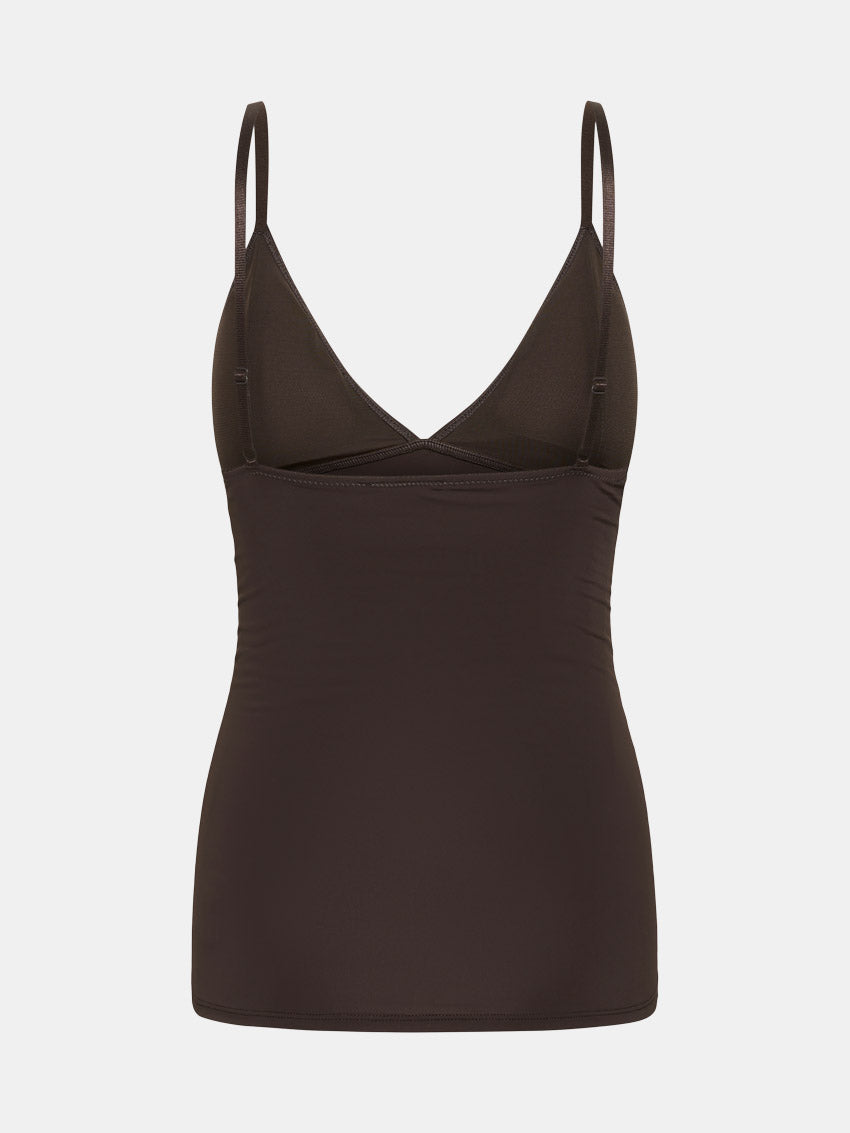 Tætsiddende top i mørkebrun med dyb v-udskæring fra Gestuz.