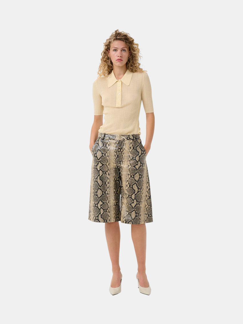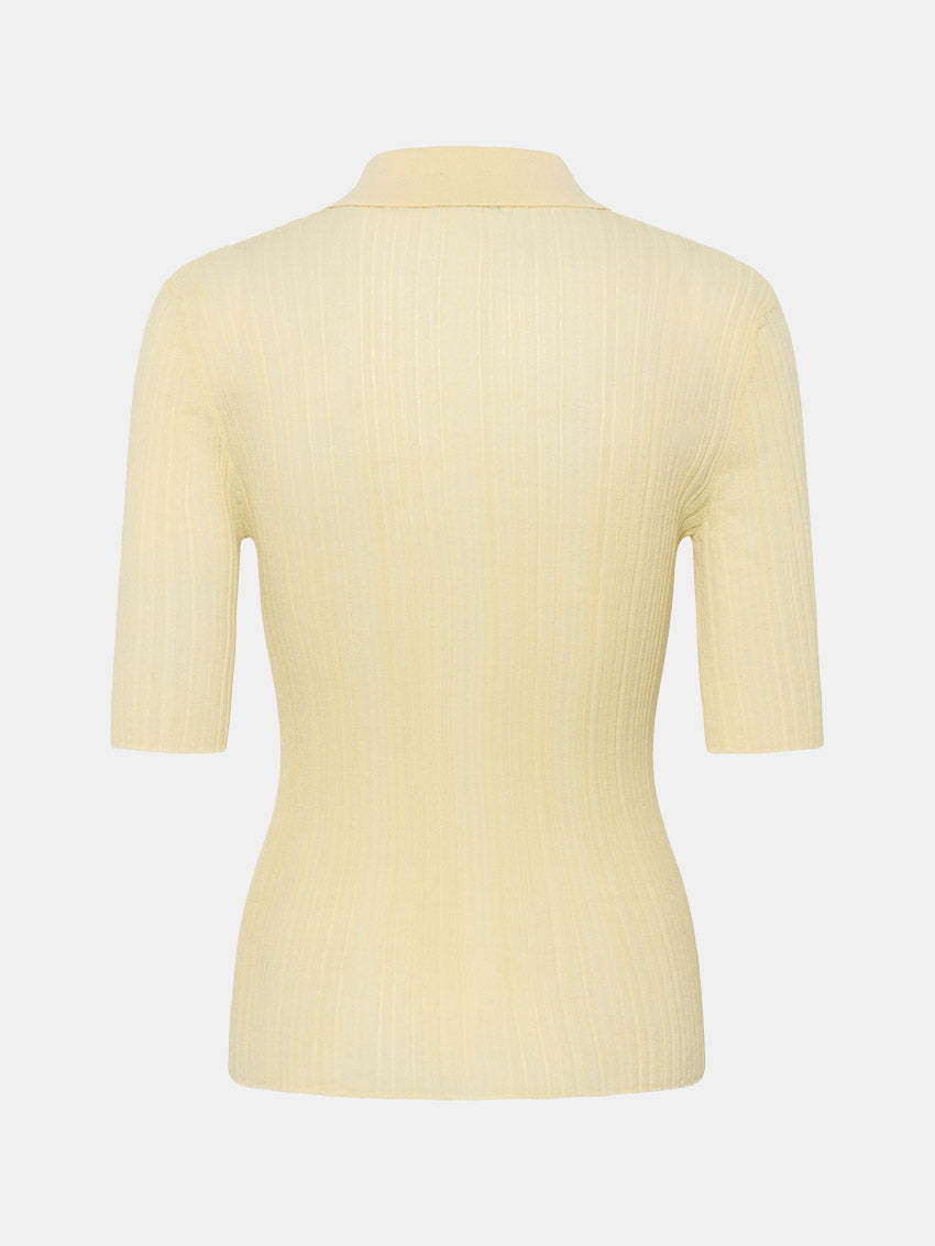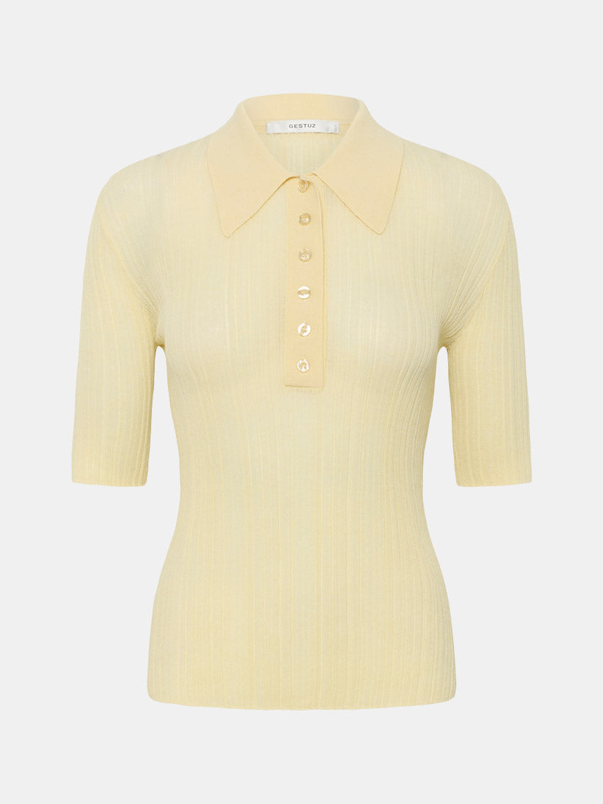 Ribstrikket polo fra Gestuz med en klassisk pasform med skræddersyet silhuet, spids krave, knaplukning og albuelange ærmer. En alsidig top, der passer både til arbejde og fritid.