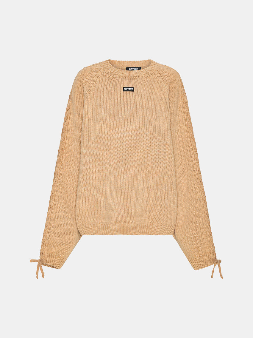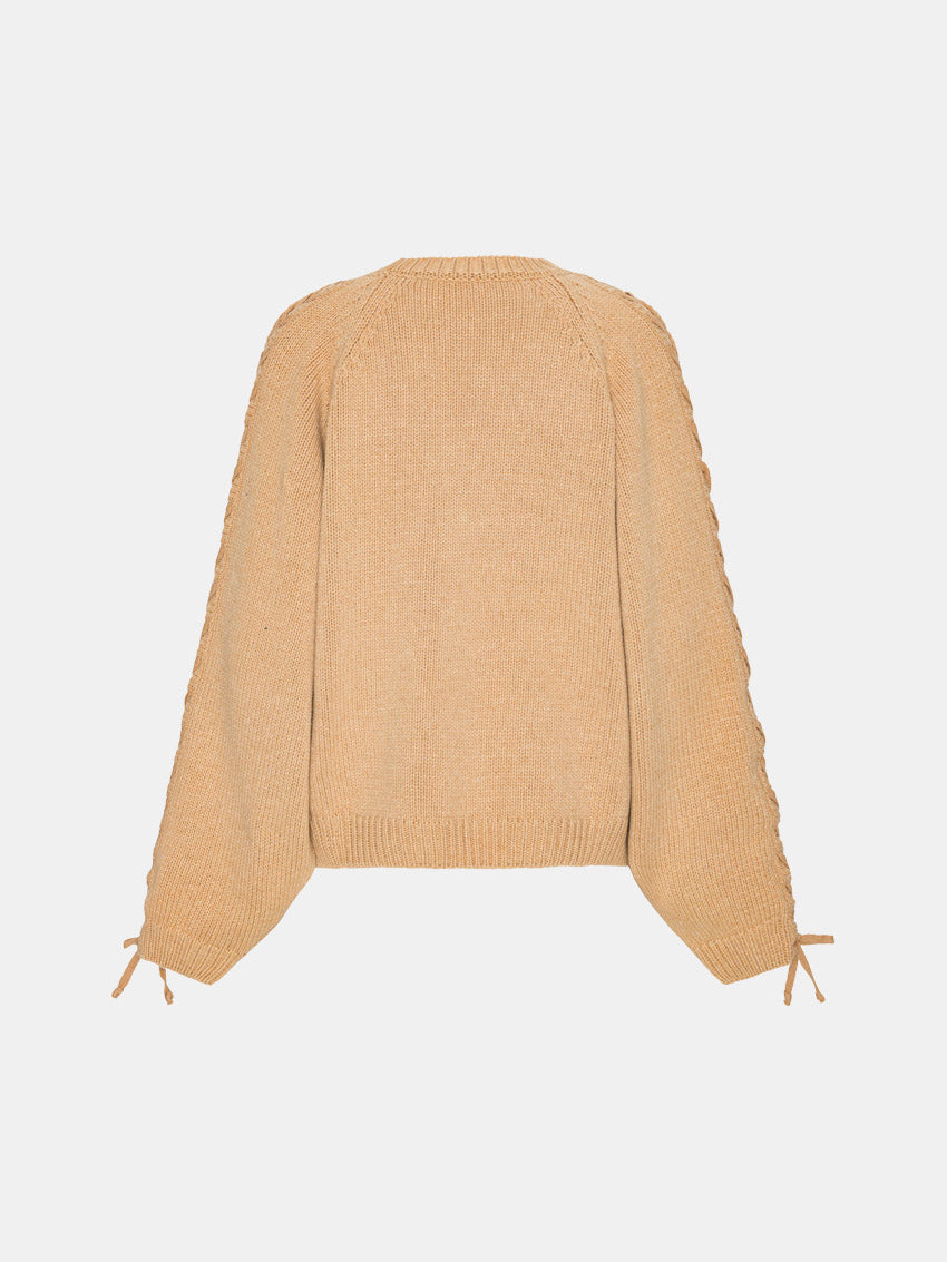 Lysebrun strik i en uld- og cashmereblanding med rund hals, ribkanter og tone-i-tone snøredetaljer på let voluminøse ærmer, afsluttet med små bånd ved manchetterne fra ROTATE.