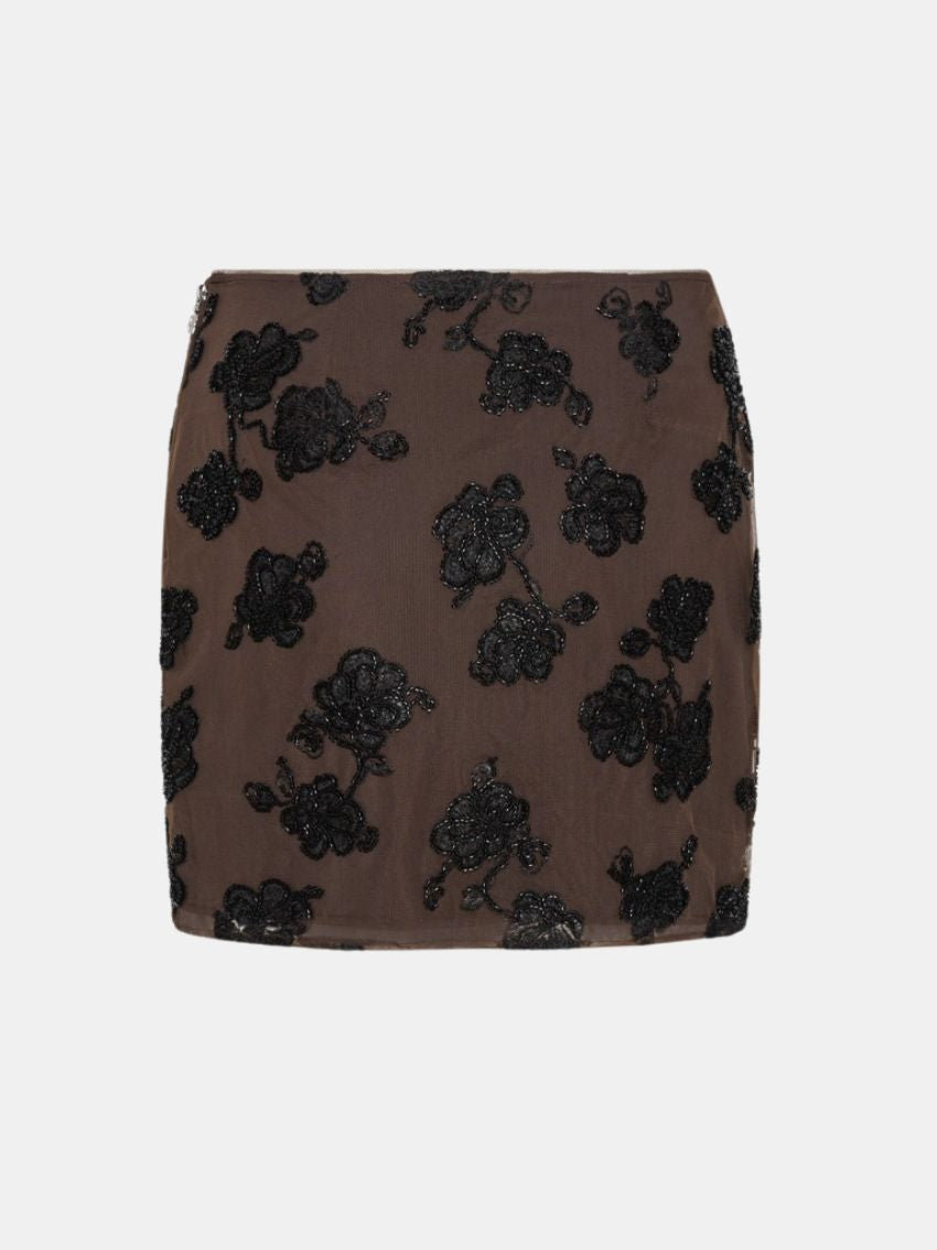Kort nederdel fra ROTATE med en tætsiddende silhuet og lige kant. Den er fremstillet i transparent mesh, detaljeret med perlebroderede blomster, som giver en rig og tekstureret overflade hele vejen rundt. Nederdelen har en enkel linning og et minimalistisk, rent finish.