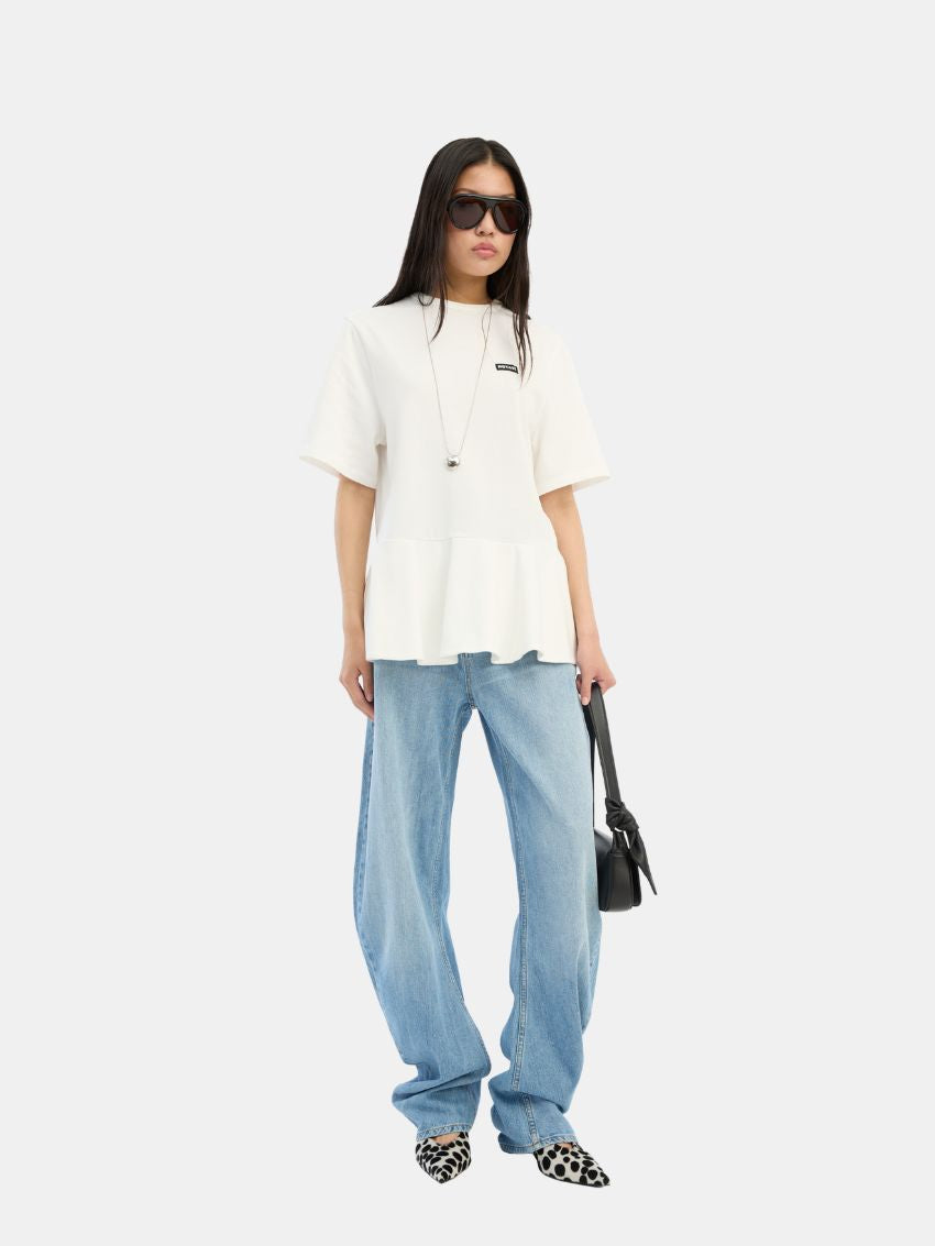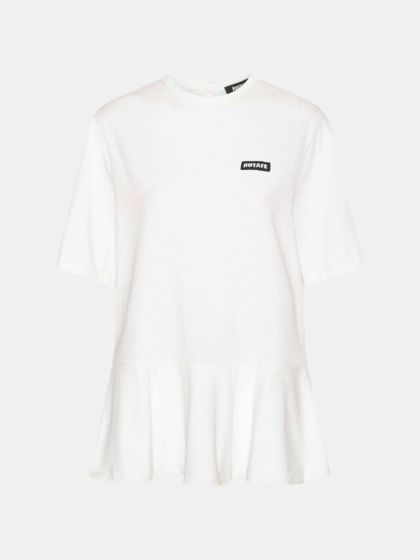 T-shirt fra ROTATE fremstillet i økologisk bomuldsjersey med korte ærmer, rund halsudskæring og en flæset peplumkant, der giver silhuetten let volumen. På bagsiden skaber et cirkelformet cutout en moderne detalje, mens et lille ROTATE-logo pryder brystet.