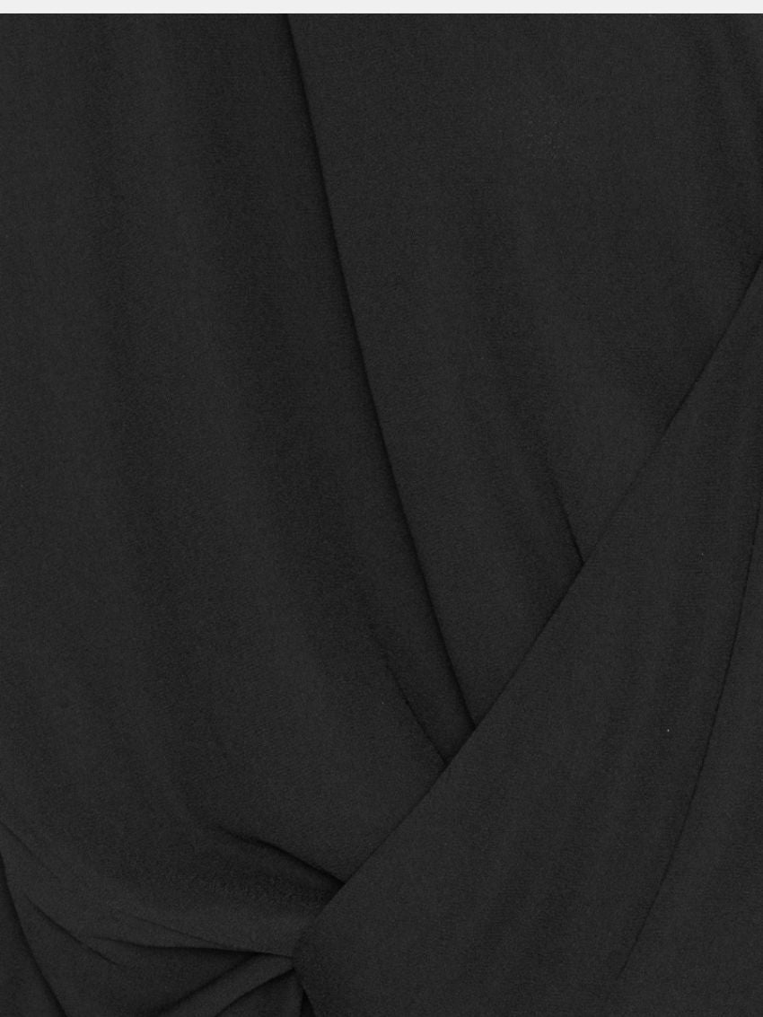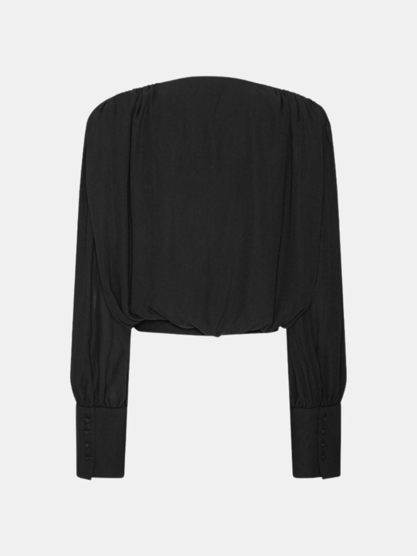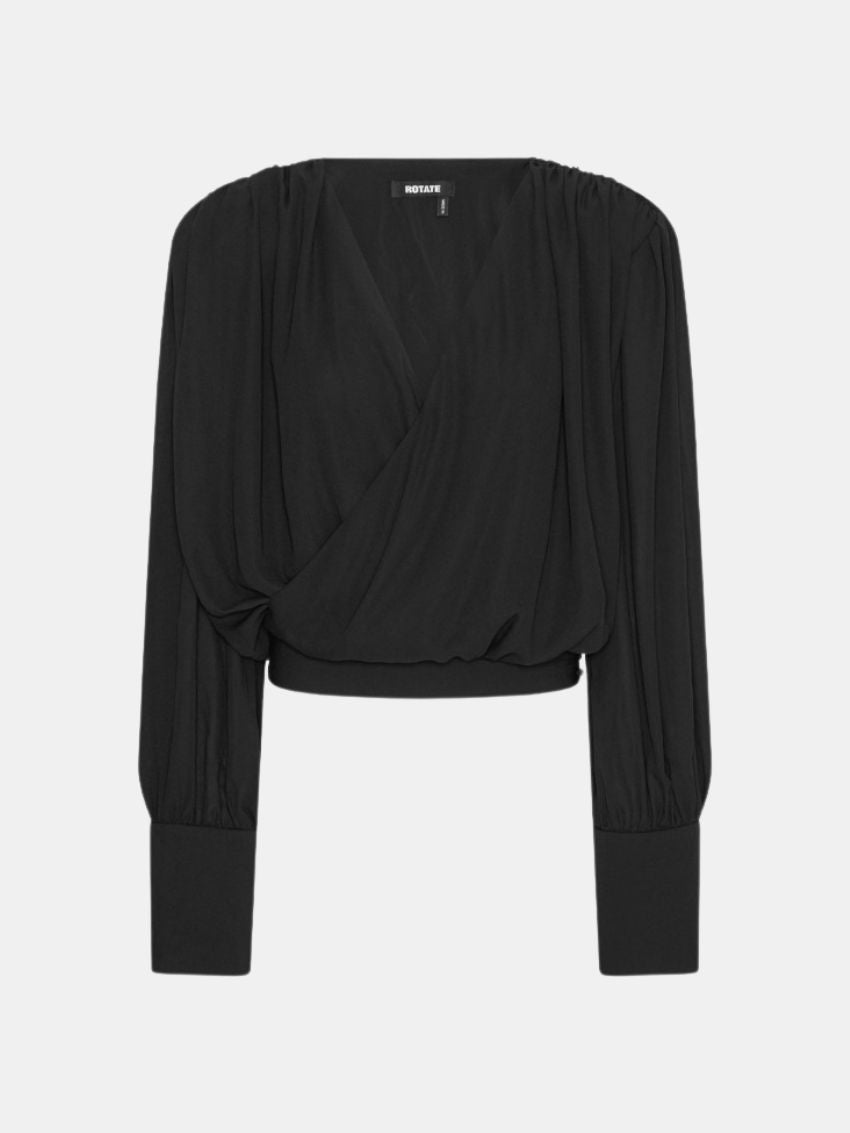 Long Sleeve V-neck Top Black fra ROTATE er en bluse med draperet wrap-front og let rynkede skuldre. Den har lange ærmer med brede manchetter og en blød tekstur, der giver et elegant og flydende udtryk.
