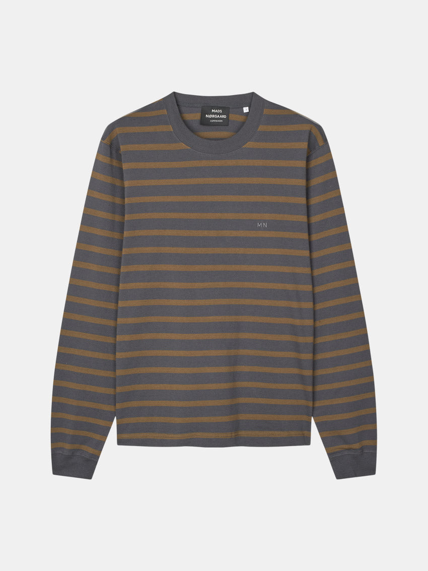 Langærmet grå t-shirt i bomuld med lysebrune striber fra Mads Nørgaard.