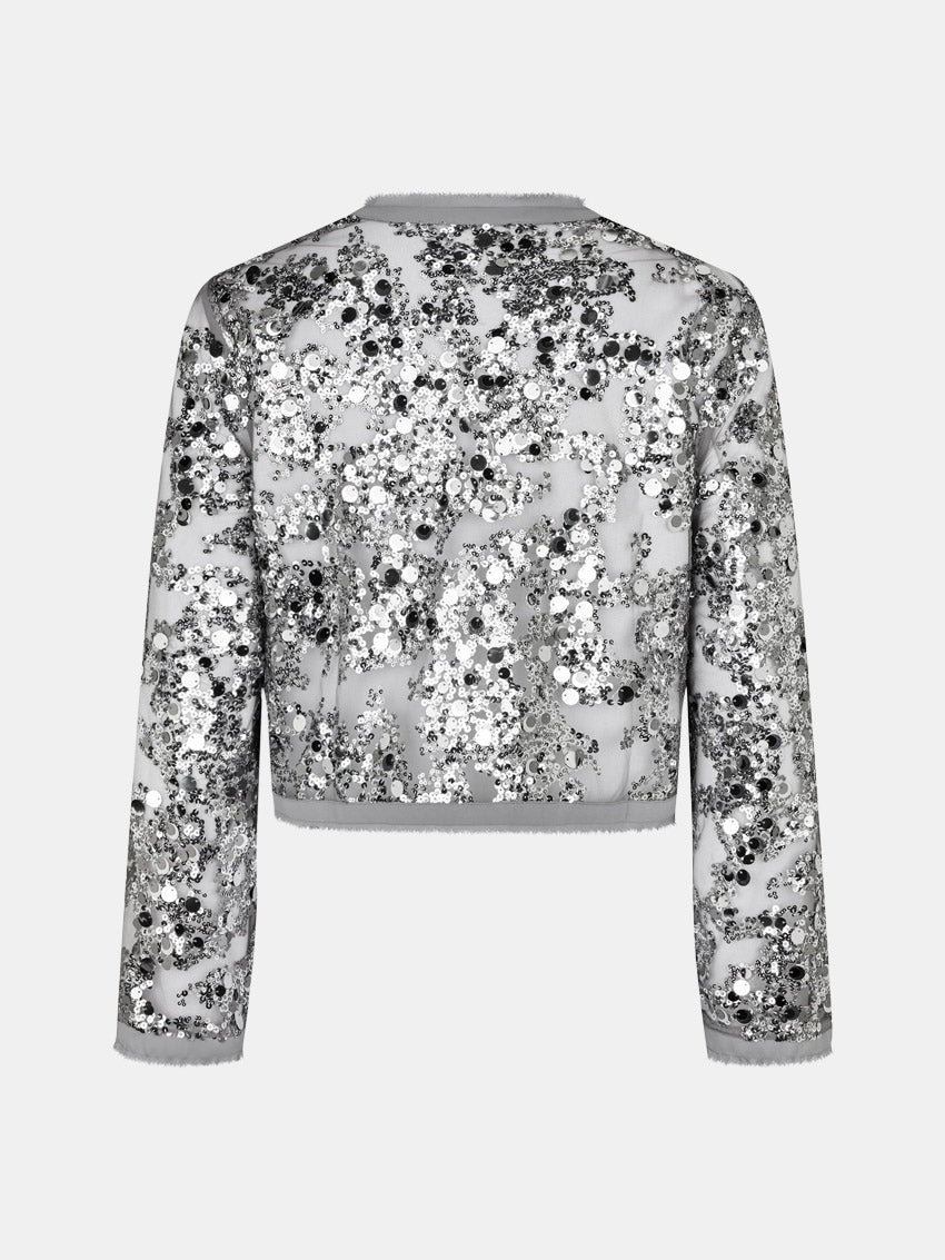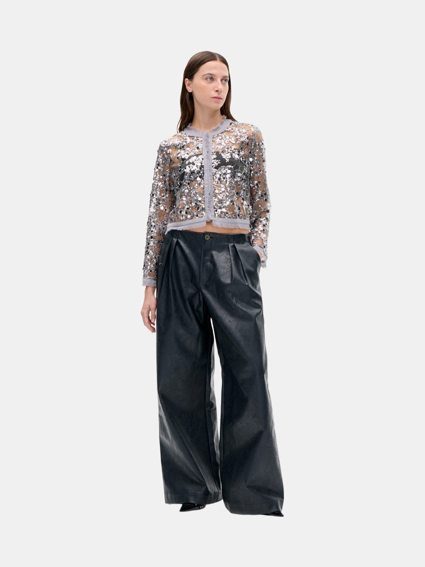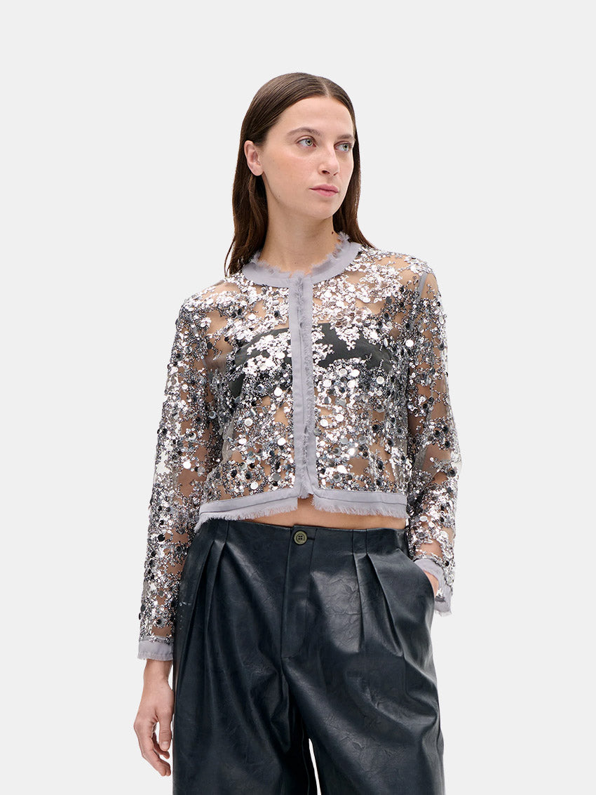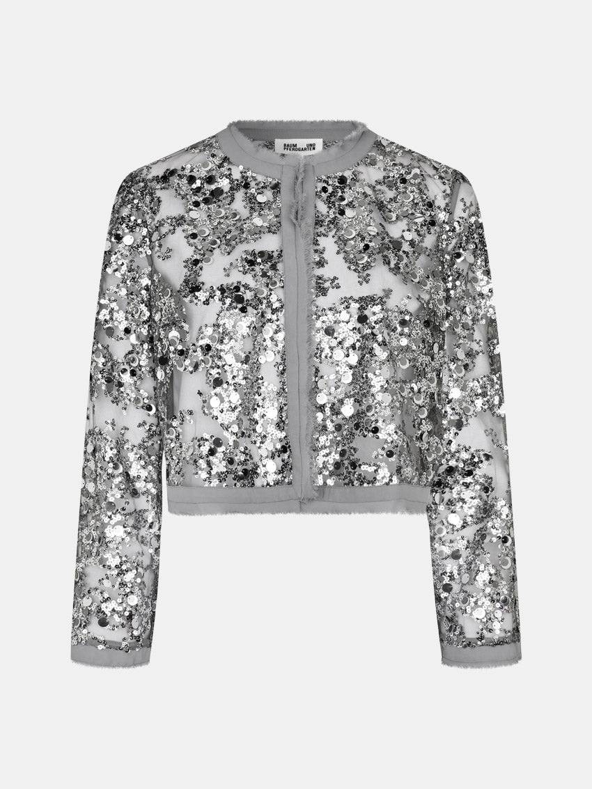 Bethina-cardiganen fra Baum Und Pferdgarten er en cropped pailletcardigan med et gennemsigtigt design. Jakken har unikke detaljer som hægtelukning, pailletdekorationer og rå kanter, der giver et moderne og festligt udtryk.