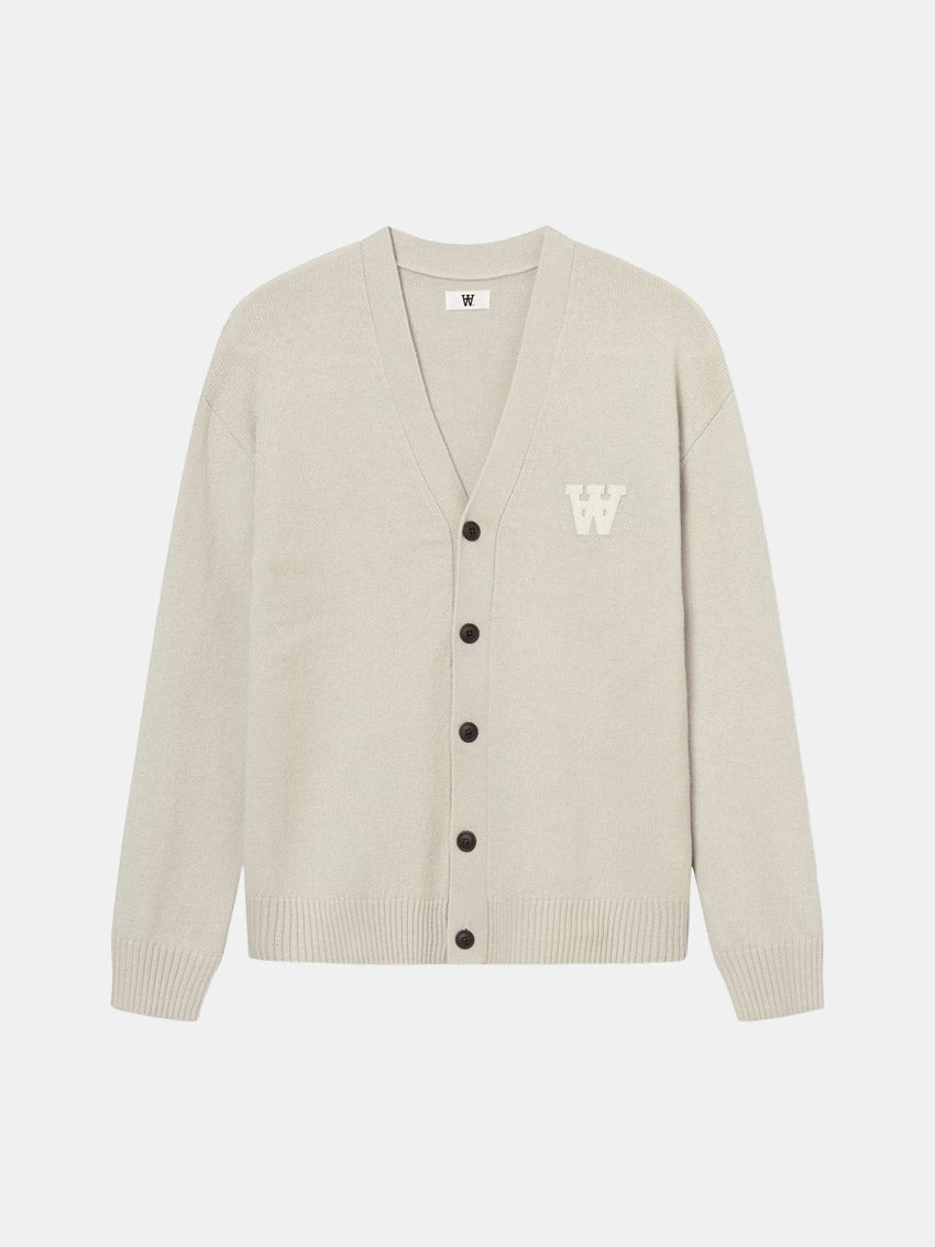 Råhvid cardigan i lammeuld med logo på brystet fra Wood Wood.