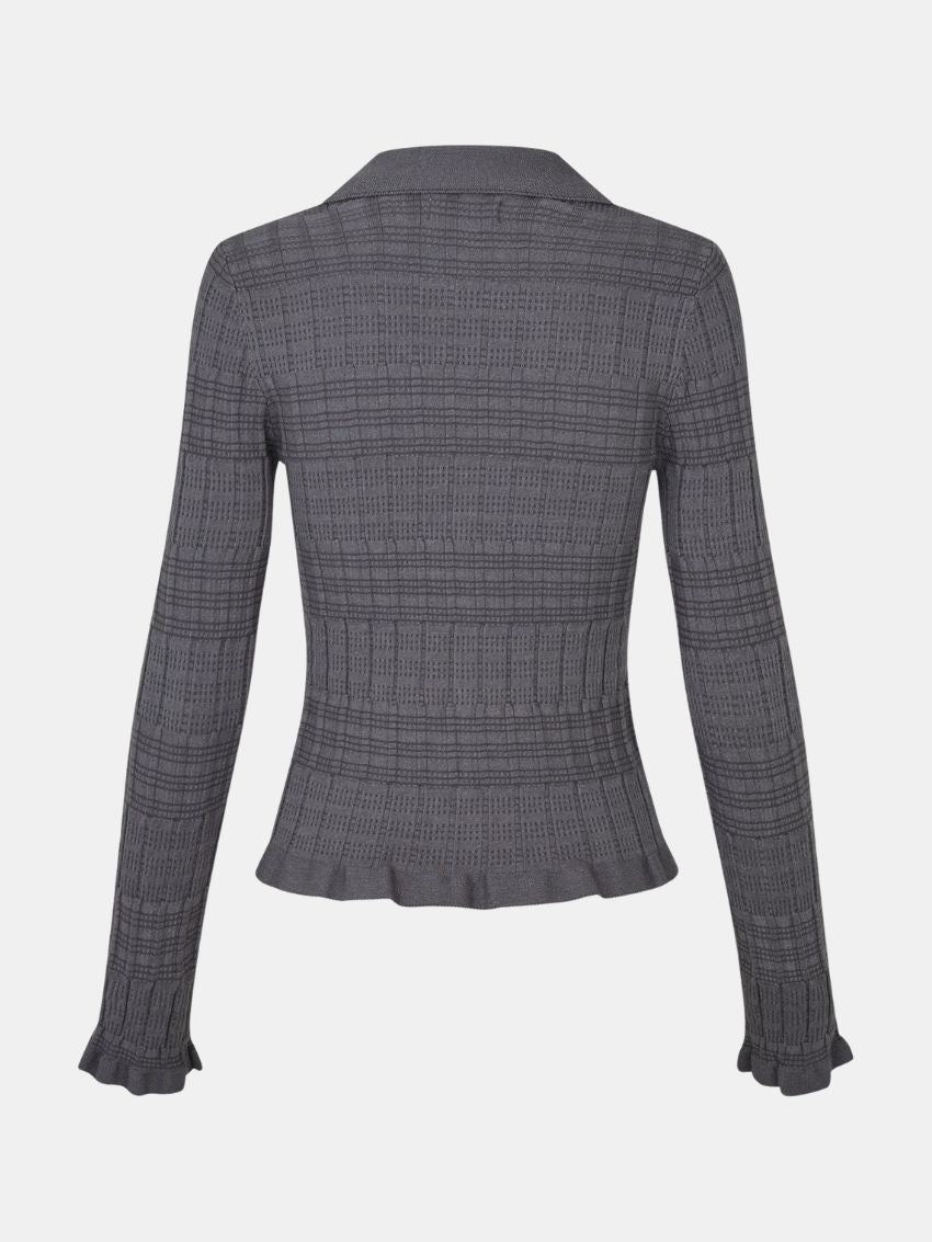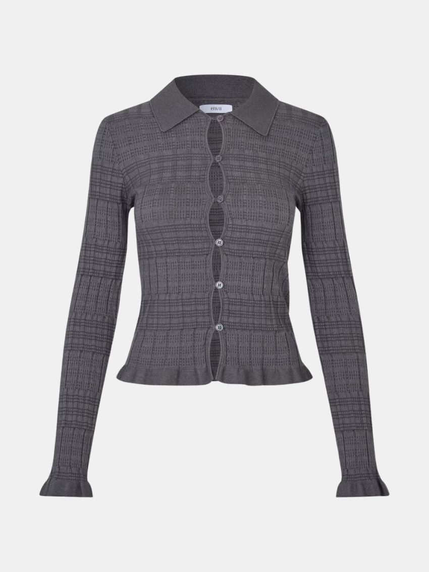 Cardigan med slank pasform og åbenstrikket, ternet struktur, der giver et let og elegant udtryk. Modellen har gennemgående knaplukning med dekorativ bølgekant langs knapstolpen samt spids skjortekrave. Afsluttet med bølgekant ved manchetter og forneden for et feminint finish. Fremstillet i en blød viskose-polyester-blanding.