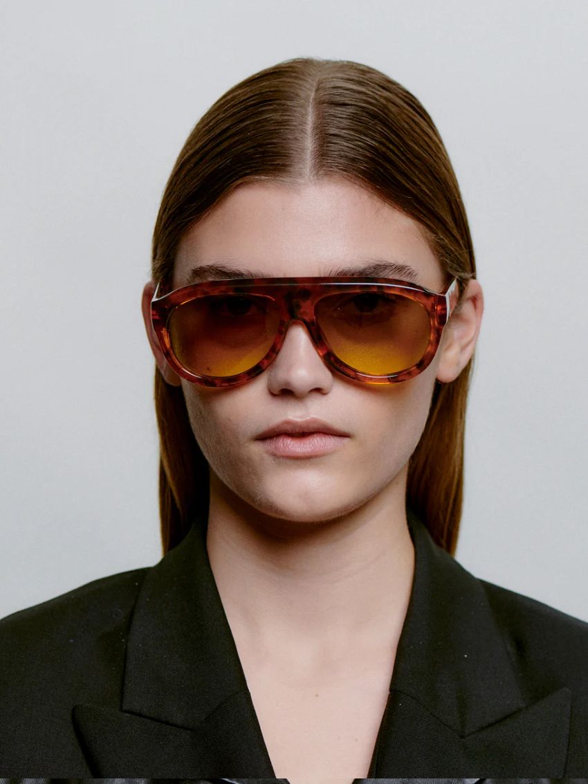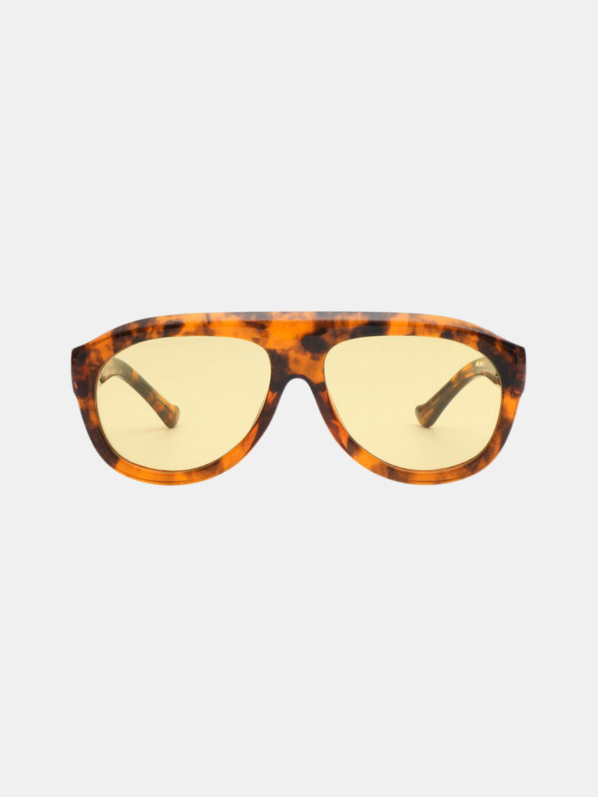 Rio Havana med brunt stel og gult glas er en moderne fortolkning af aviator-stilen med en markant, skulpturel ramme fra A. Kjærbede. Den store silhuet skaber et iøjnefaldende look og gør solbrillen perfekt til solrige dage med selvsikker stil.