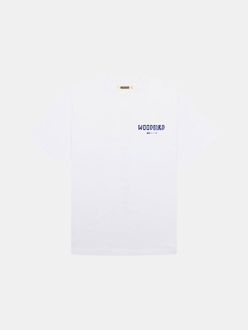 Hvid t-shirt økologisk bomuld med rund hals og korte ærmer. Designet har et diskret logo på brystet og et stort grafisk print af en dampende skål på ryggen, der giver et legende og moderne udtryk til hverdagsgarderoben fra WoodBird.