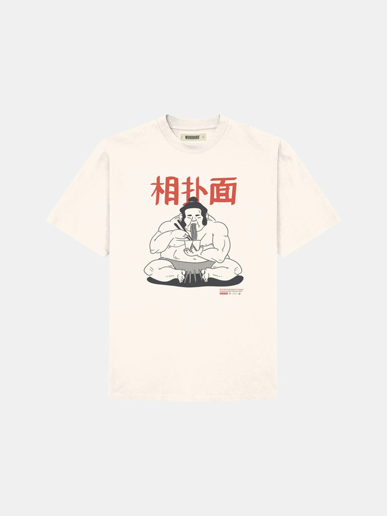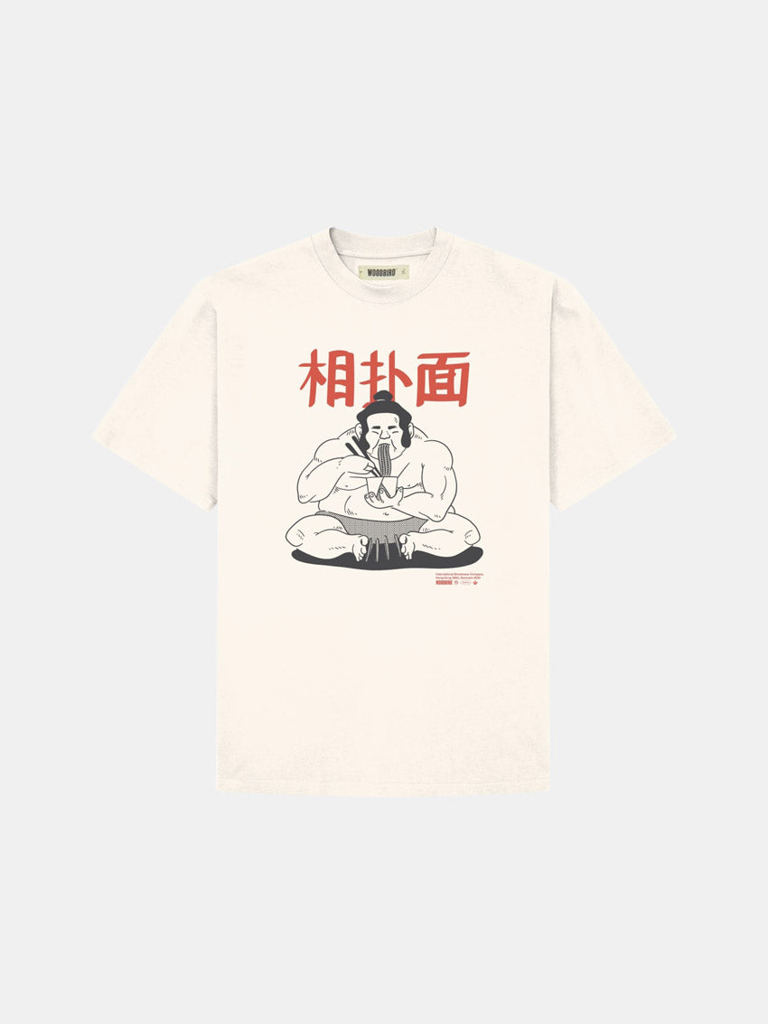 T-shirt i økologisk bomuld med rund hals og korte ærmer. Fronten prydes af et stort grafisk print af en sumo, der spiser ramen, hvilket giver et sjovt og markant udtryk til hverdagsgarderoben fra WoodBird.