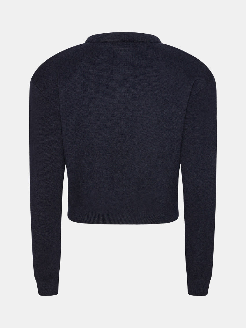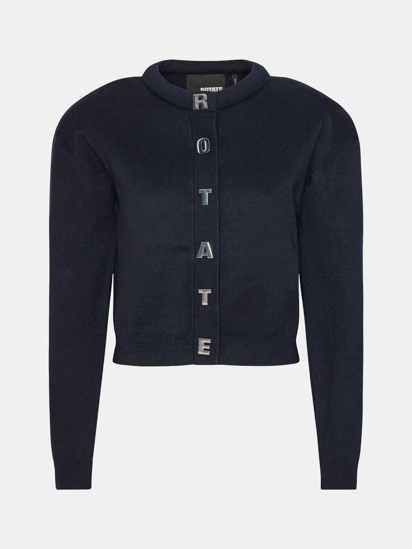 Cropped mørkeblå cardigan med rund hals, aftagelige skulderpuder og metalbogstaver med ROTATE-logo foran fra ROTATE. Strikket i en blød blanding af certificeret bomuld og cashmere.