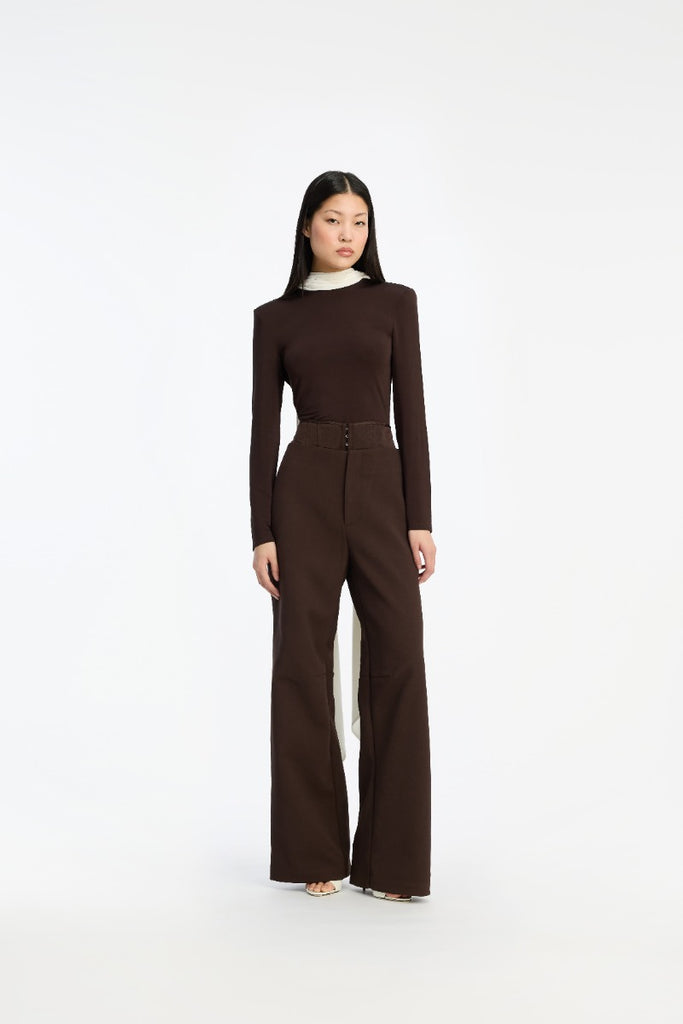 Smukke wide-leg bukser i mørkebrun med struktureret, korsetinspireret talje i kontrastsatinstof. Forsynet med synlige hægter foran og justerbar bindedetalje bagpå fra ROTATE. Perfekt sammen med Suiting Belted Blazer Dark Brown.