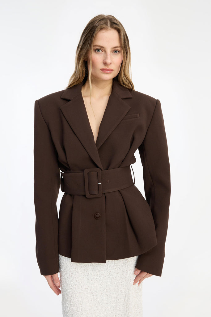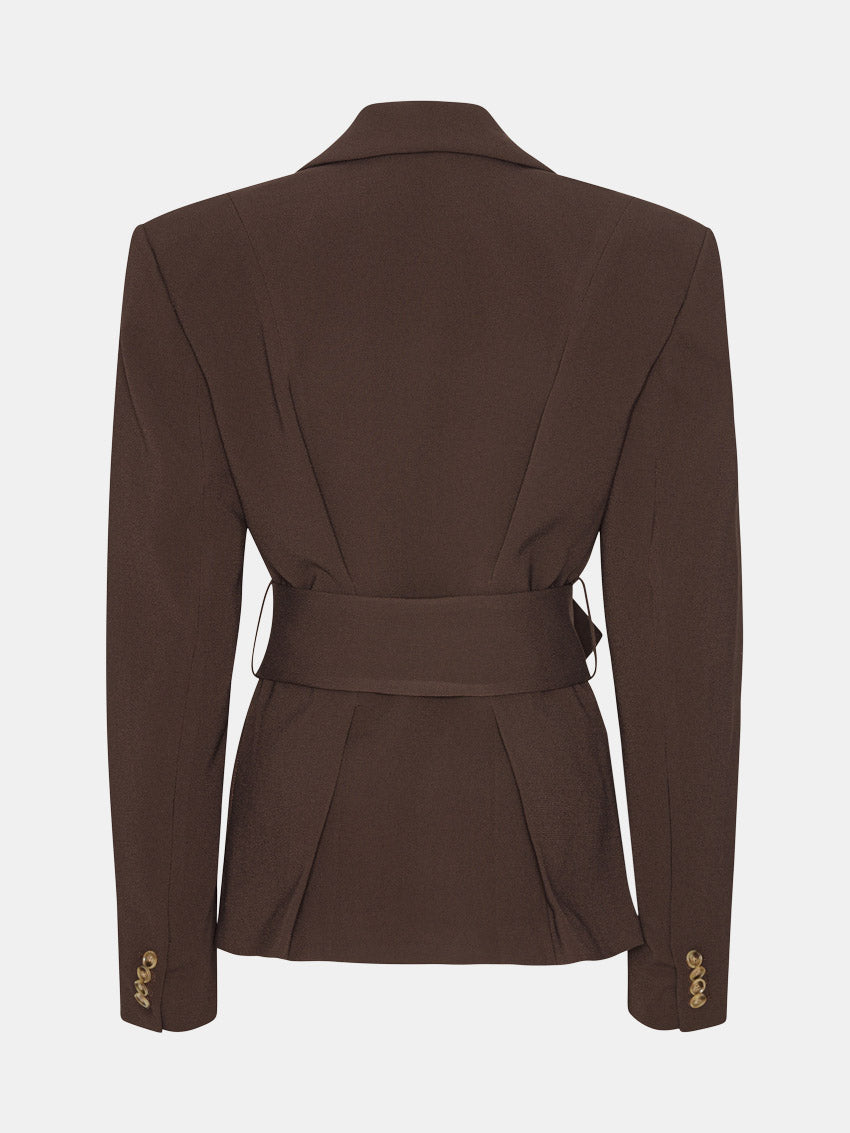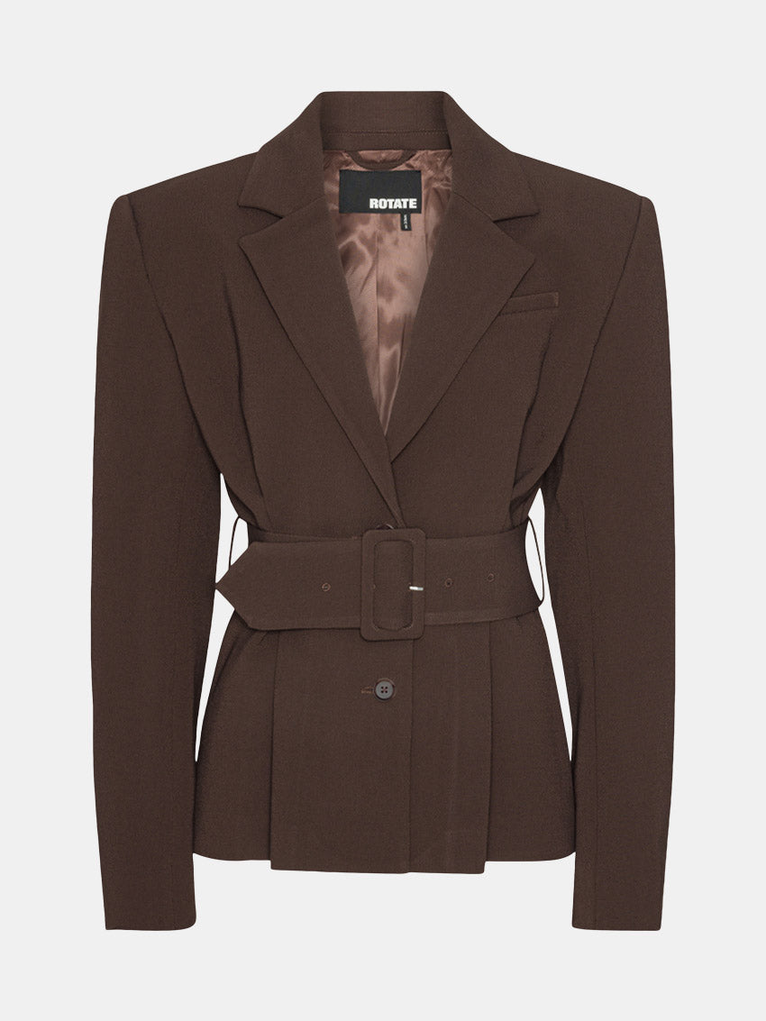 Elegant blazer i mørkebrun med markerede skuldre, lange ærmer og aftageligt bælte med stofbetrukket spænde fra ROTATE. Style den med de smukke, matchende bukser for et fuldendt look.