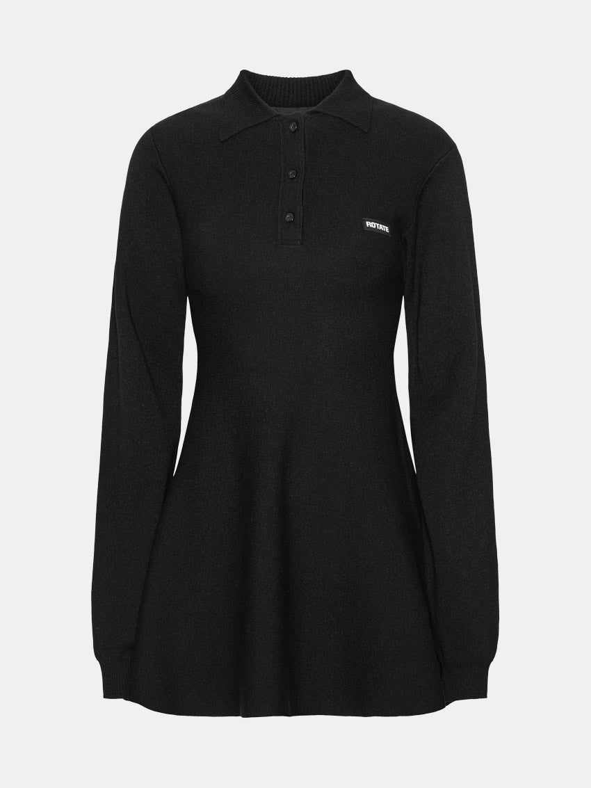 Tætsiddende kjole i sort med lange ærmer, polo-krave og knaplukning foran. Kjolen har flæset kant, struktureret strik og ROTATE-logo på brystet fra ROTATE.