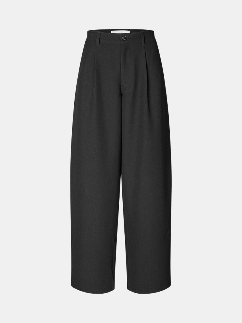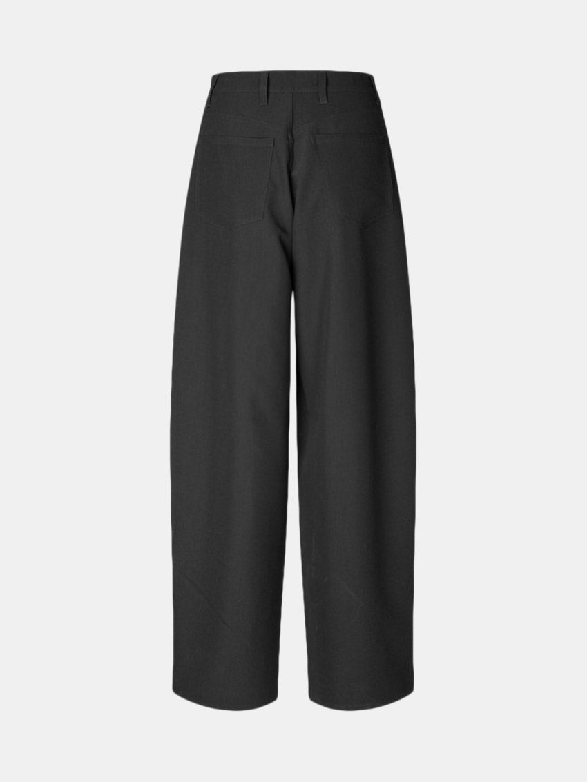 Bukser med mellemhøj talje, løs pasform og vide ben. Designet har knap- og lynlåslukning foran, skrå sidelommer foran, påsatte lommer bagpå samt læg foran. Fremstillet i en elastisk blanding af genanvendt polyester.