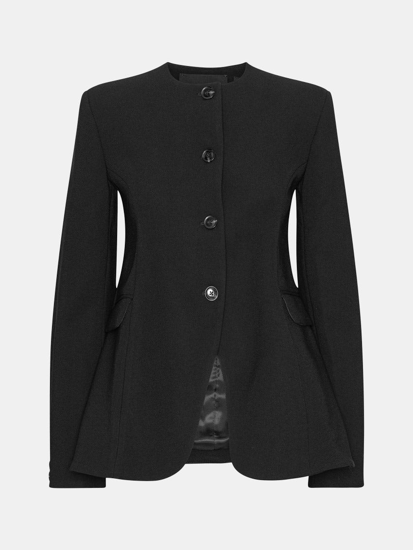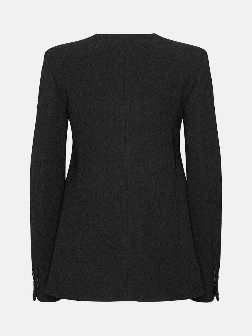 Sort, skræddersyet jakke i moderne design med flared kant, kravefri hals og knaplukning foran. En elegant og alsidig jakke til både hverdag og festlige lejligheder fra ROTATE.