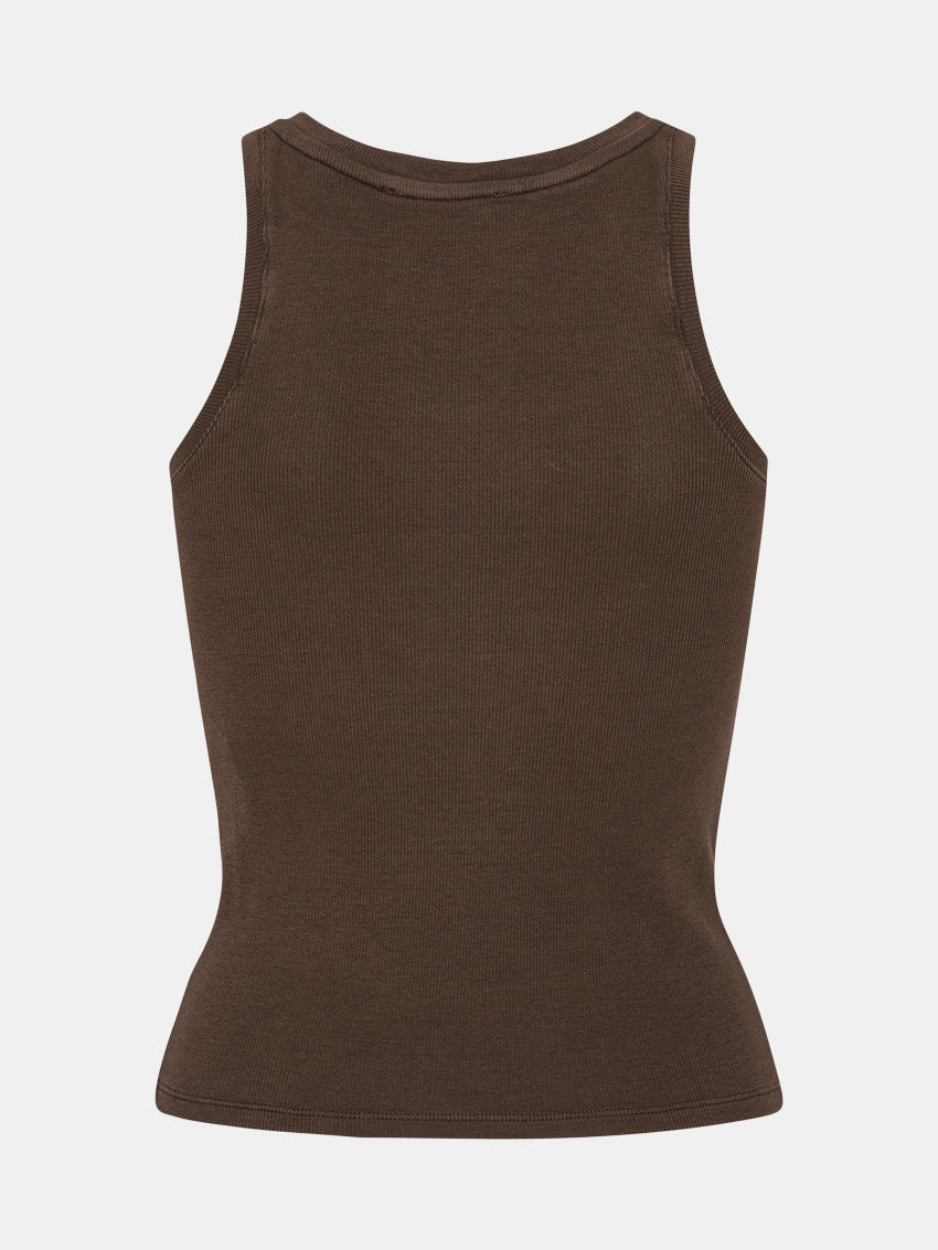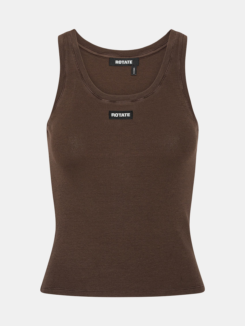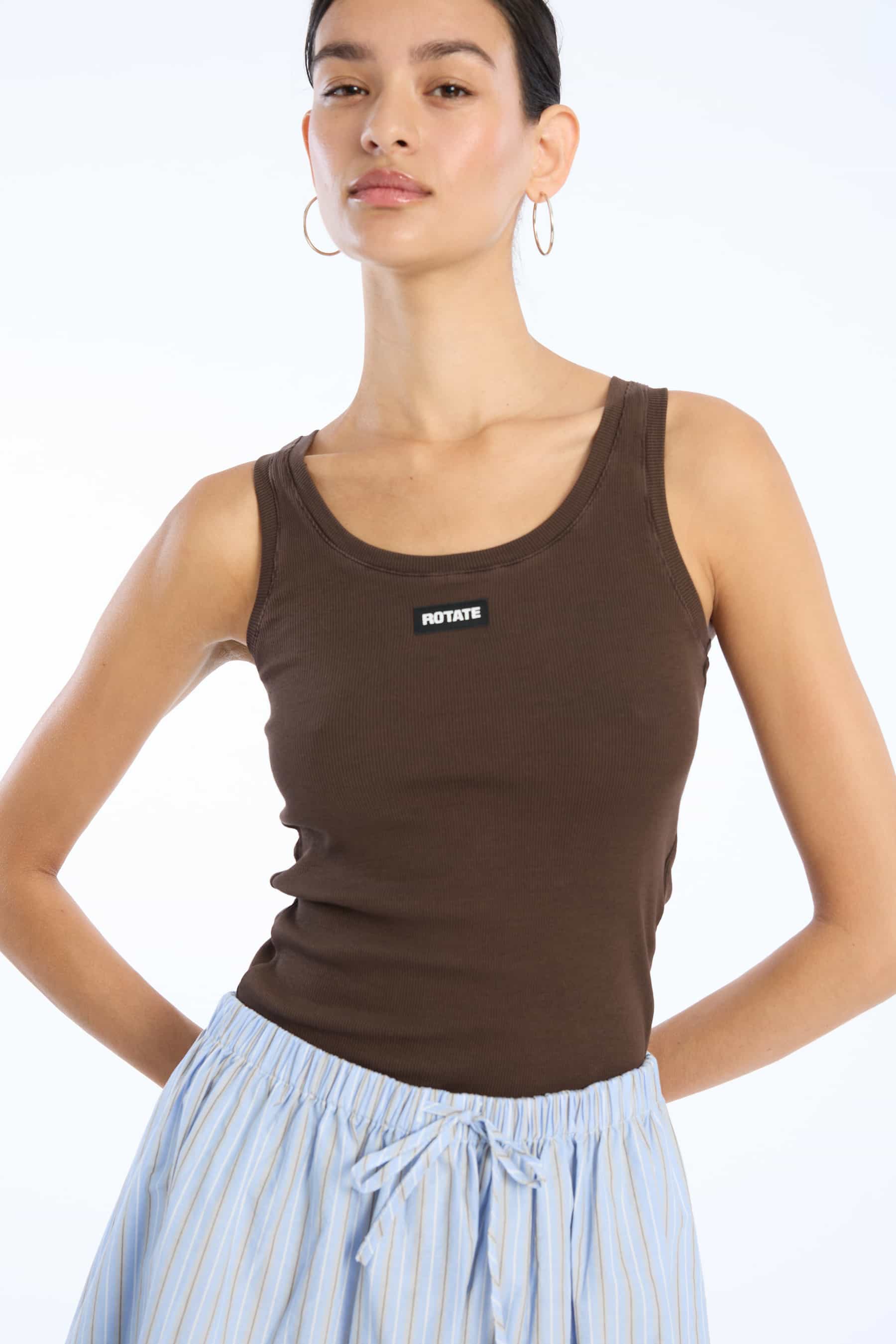 Ribbet tanktop i mørkebrun med lille badge-logo foran fra ROTATE.