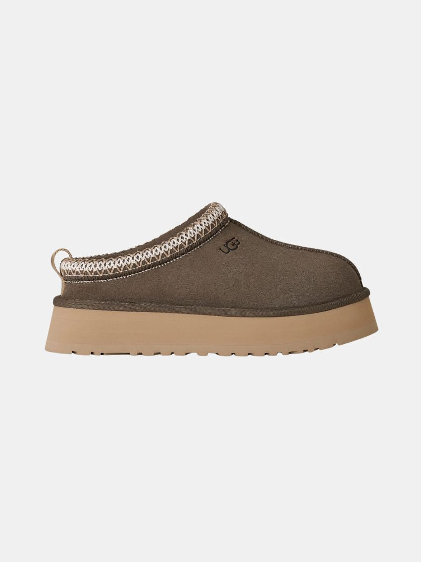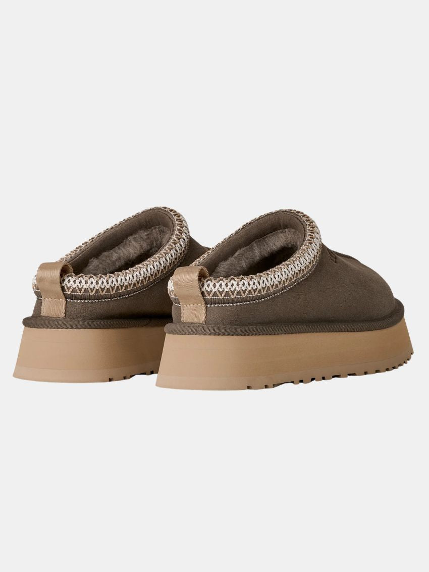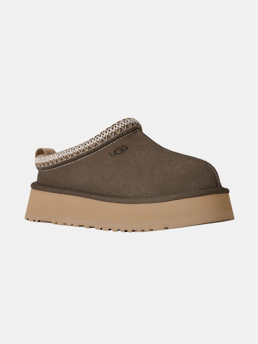 UGG W Tazz II i farven Dried Oregano. Platformskoene kombinerer UGGs ikoniske flettede detaljer med en holdbar konstruktion, perfekt til hele dagen. Overdelen er lavet af premium ruskind og foret indvendigt med luksuriøst fåreskind for maksimal komfort. Den innovative ydersål i miljøvenlig sukkerrørs-EVA har en forbedret rocker-form, der understøtter en naturlig og ubesværet gang. UGG W Tazz II forener stil og funktionalitet til din hverdag.