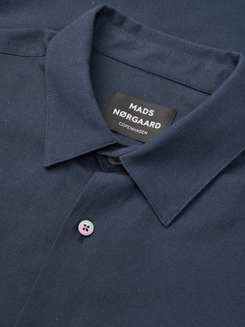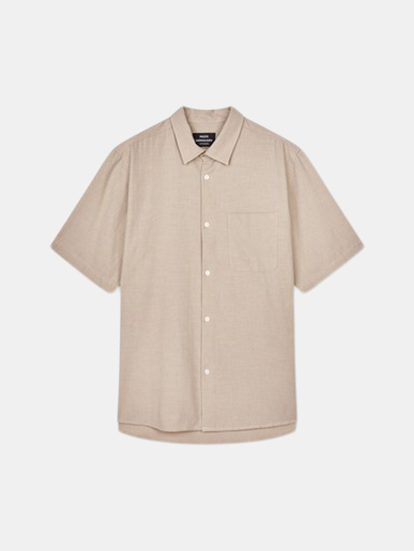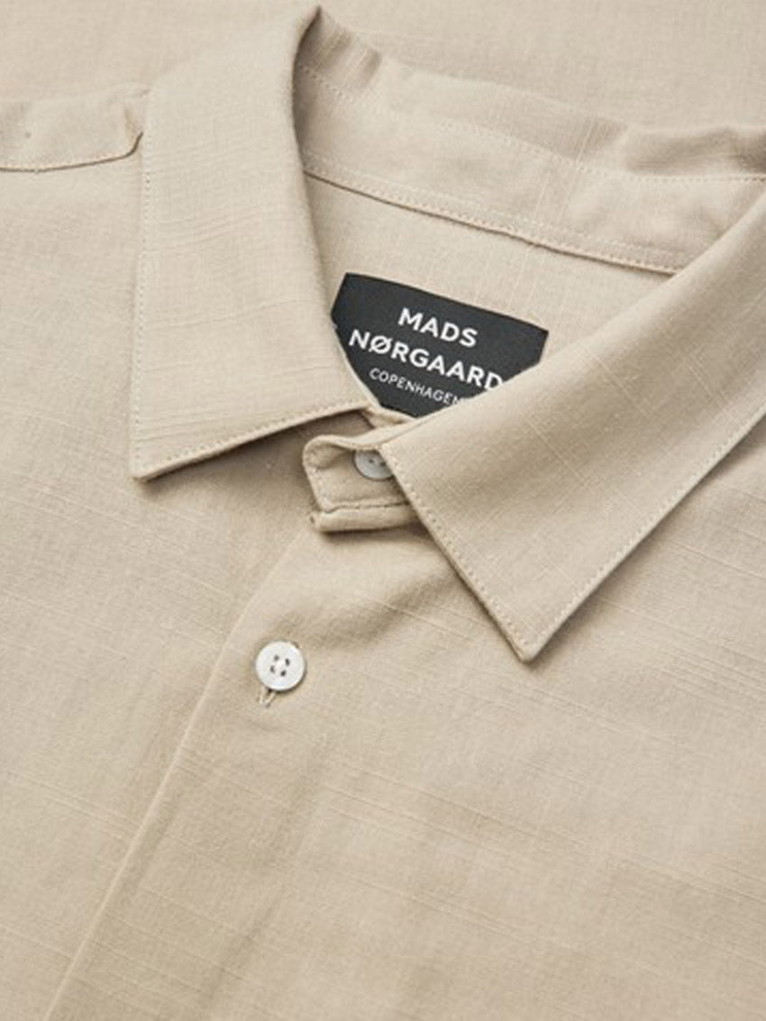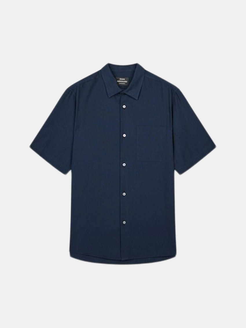 Kortærmet skjorte fra Mads Nørgaard med klassisk pasform, designet med små knapper, cut-away krave og en diskret brystlomme, der giver et tidløst og stilrent udtryk.