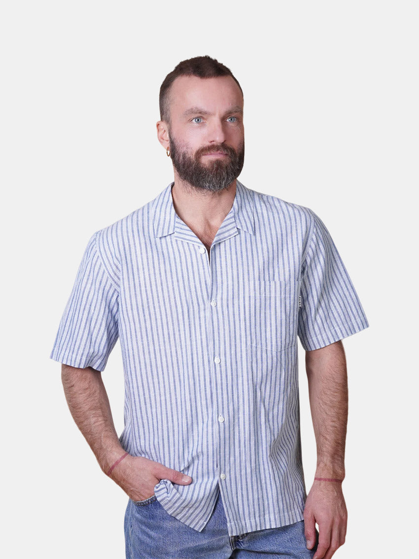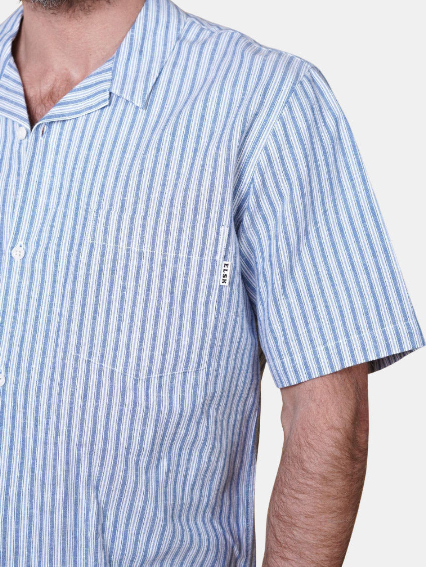 Stribet kortærmet skjorte af økologisk bomuld og hør med corozoknapper, brystlomme og diskret ELSK-logo fra ELSK.