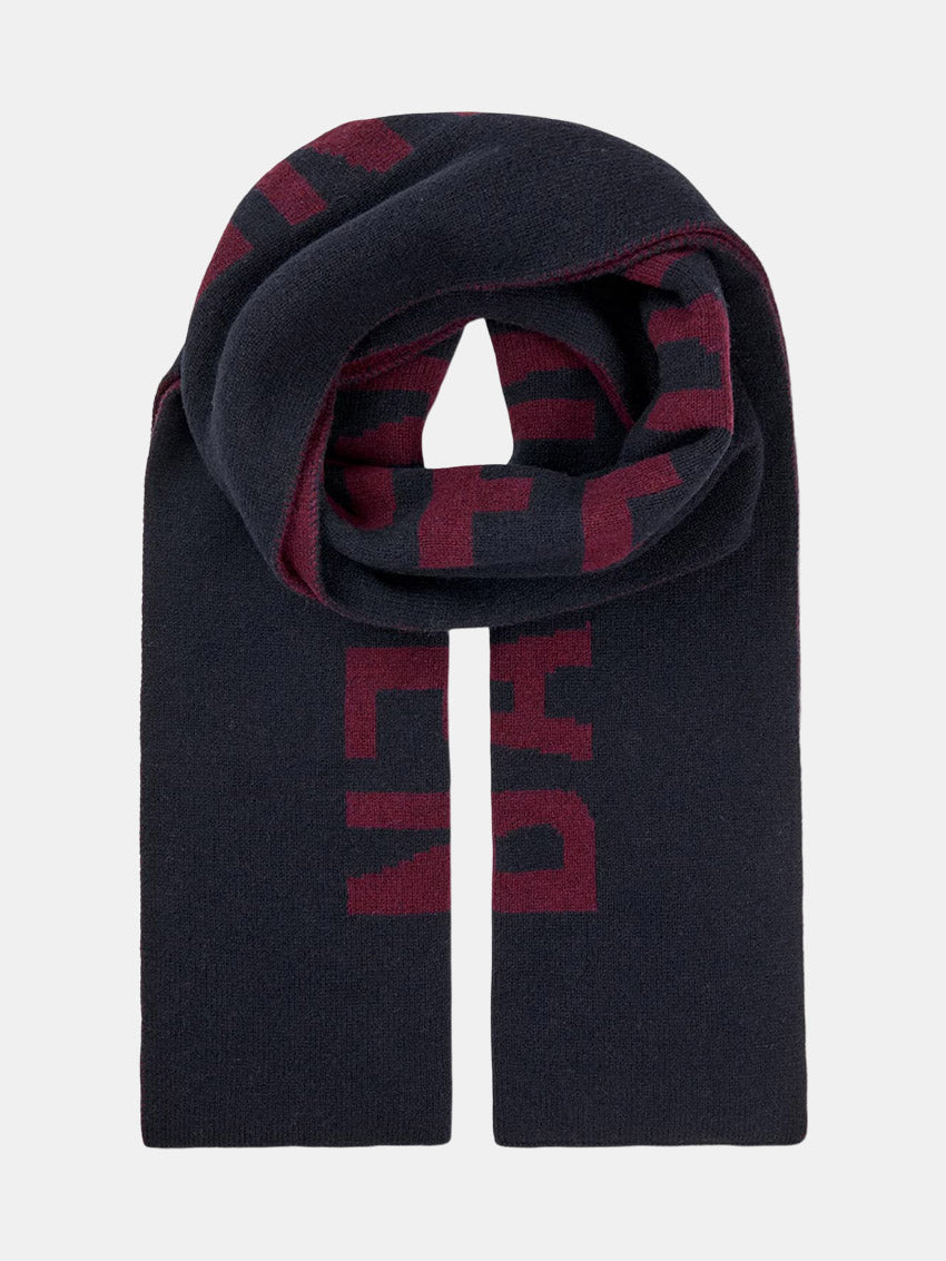 Mørkeblåt tørklæde i merinould med bordeaux rød logo fra Baum und Pferdgarten.