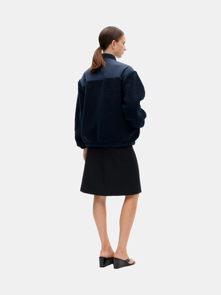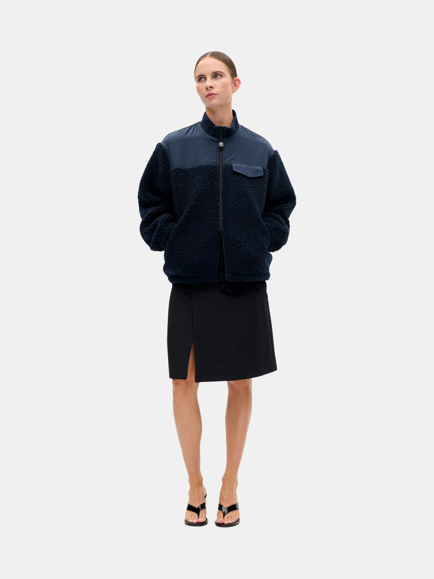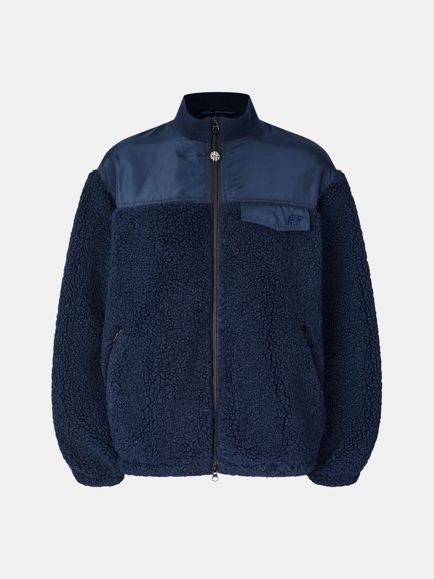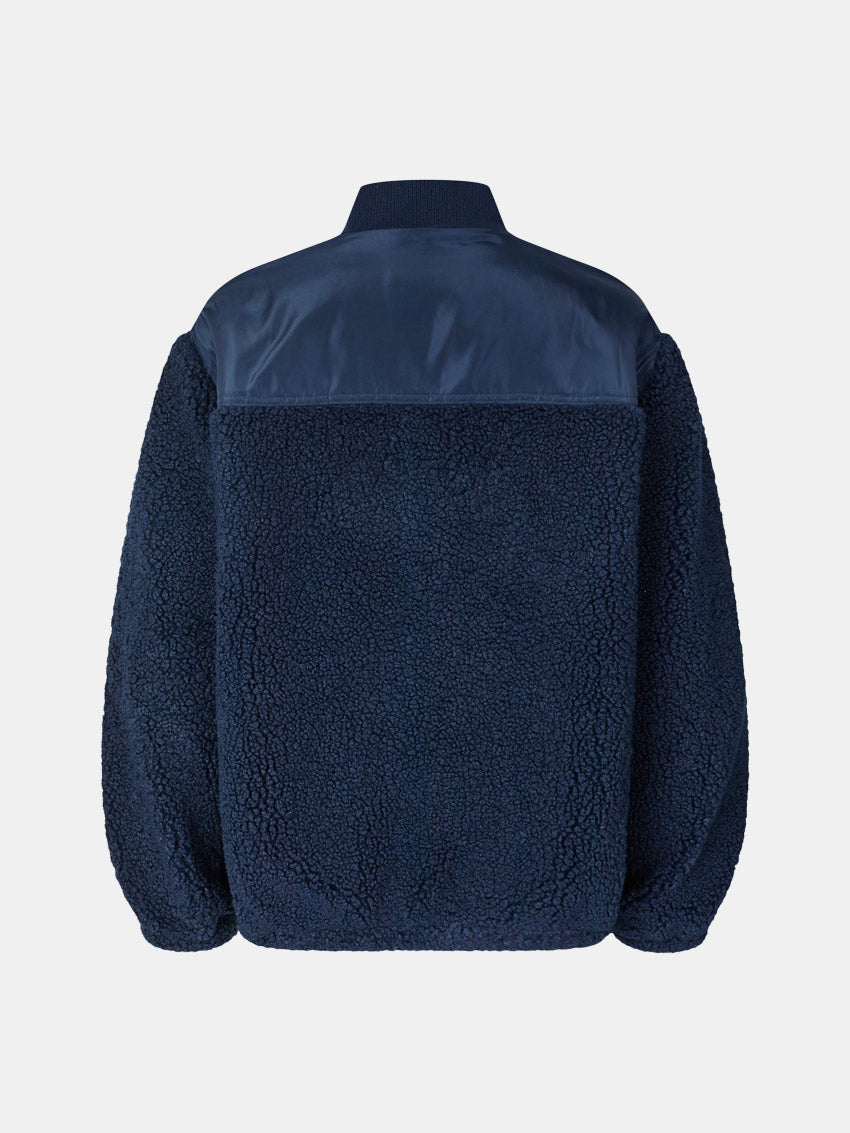 Blå jakke fra Baum Und Pferdgarten, som er lavet i blød fleece i en blanding med genanvendt polyester. Jakken har en løs pasform med sænkede skuldre og en ribbet, opretstående krave for ekstra komfort. Designet er udstyret med elastiske kanter, sidelommer med lynlås og en tovejs lynlåslukning for praktisk brug.