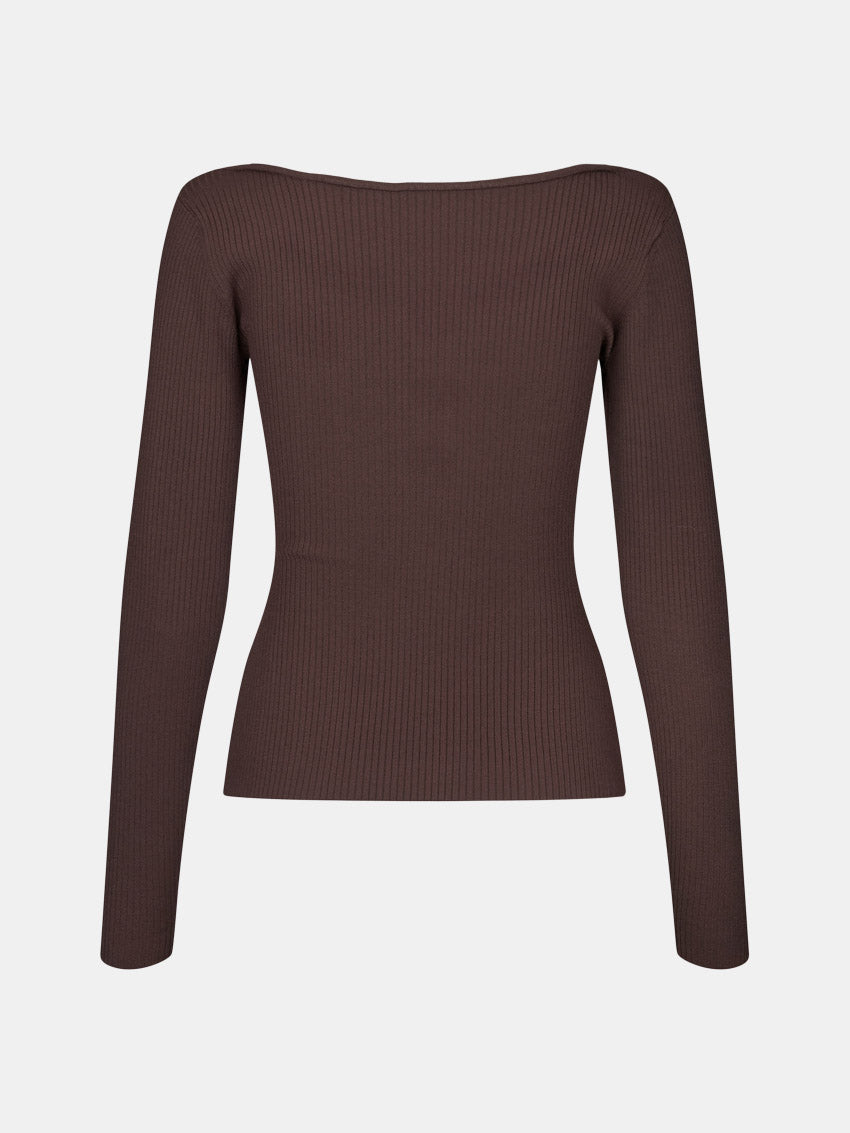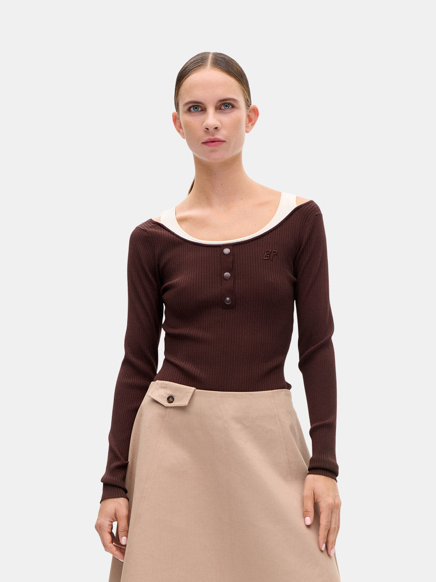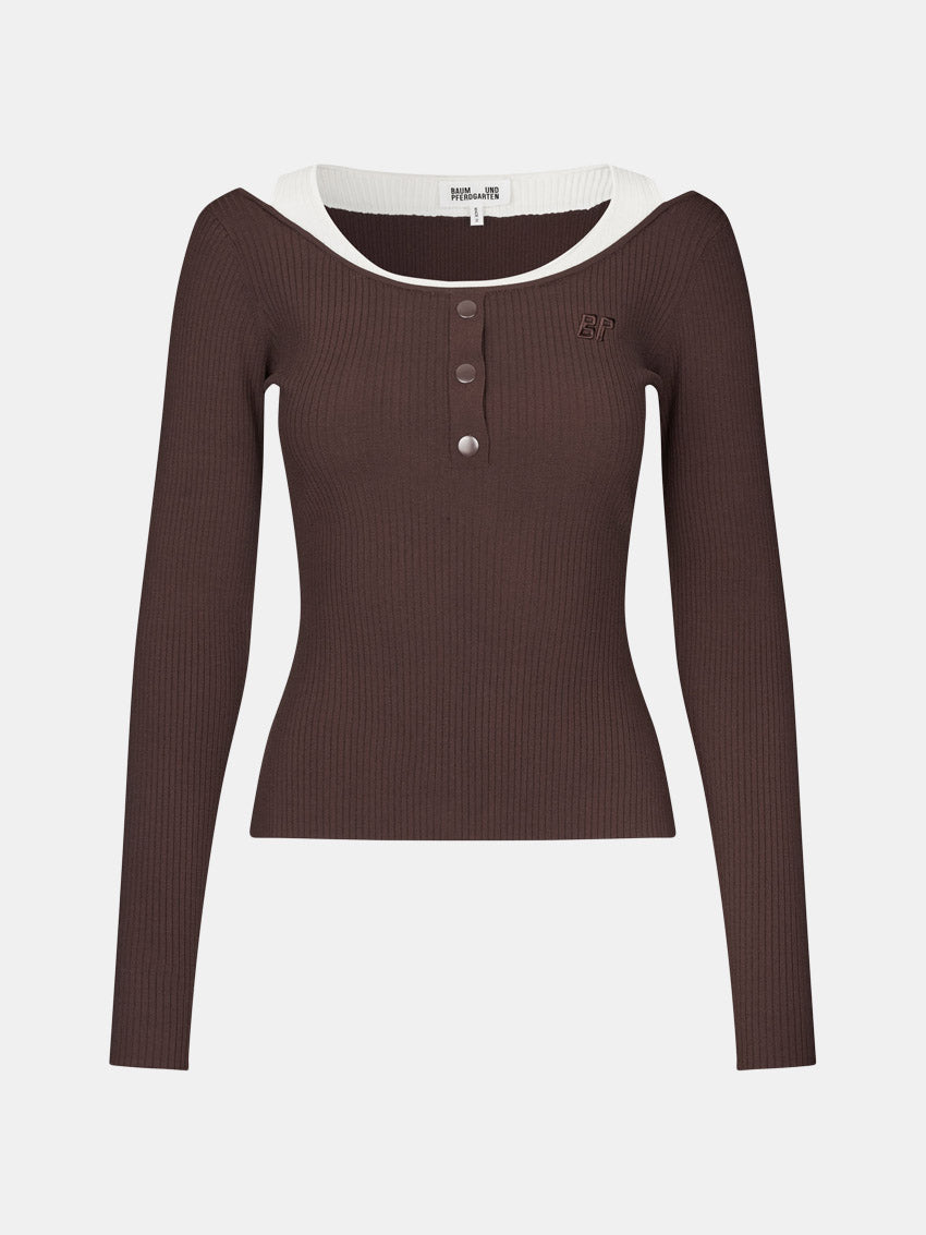 Brun bluse fra Baum Und Pferdgarten er ideel til lag-på-lag og er lavet i fintstrikket, ribbet viskose, der giver en blød og elastisk pasform. Dekorative knapper og et broderet logo på brystet tilføjer diskrete detaljer.