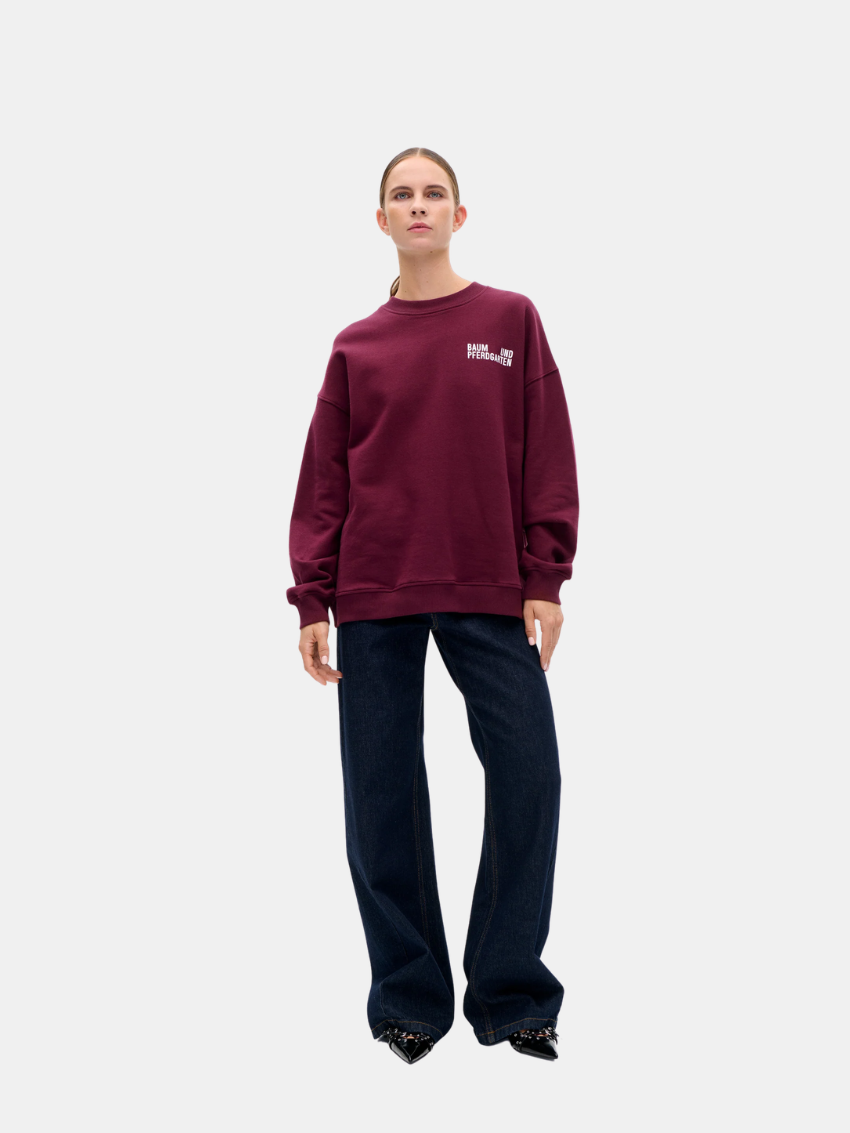 Julle Sweatshirt fra Baum Und Pferdgarten er fremstillet i den blødeste økologiske bomuld og designet med en oversized pasform og sænkede skuldre, der giver et afslappet udtryk. Den har en klassisk rund hals samt ribkanter ved ærmer og bund for en behagelig pasform. Sweatshirten er dekoreret med et printet Baum und Pferdgarten-logo på både brystet og ryggen, som giver et stilrent og genkendeligt look.