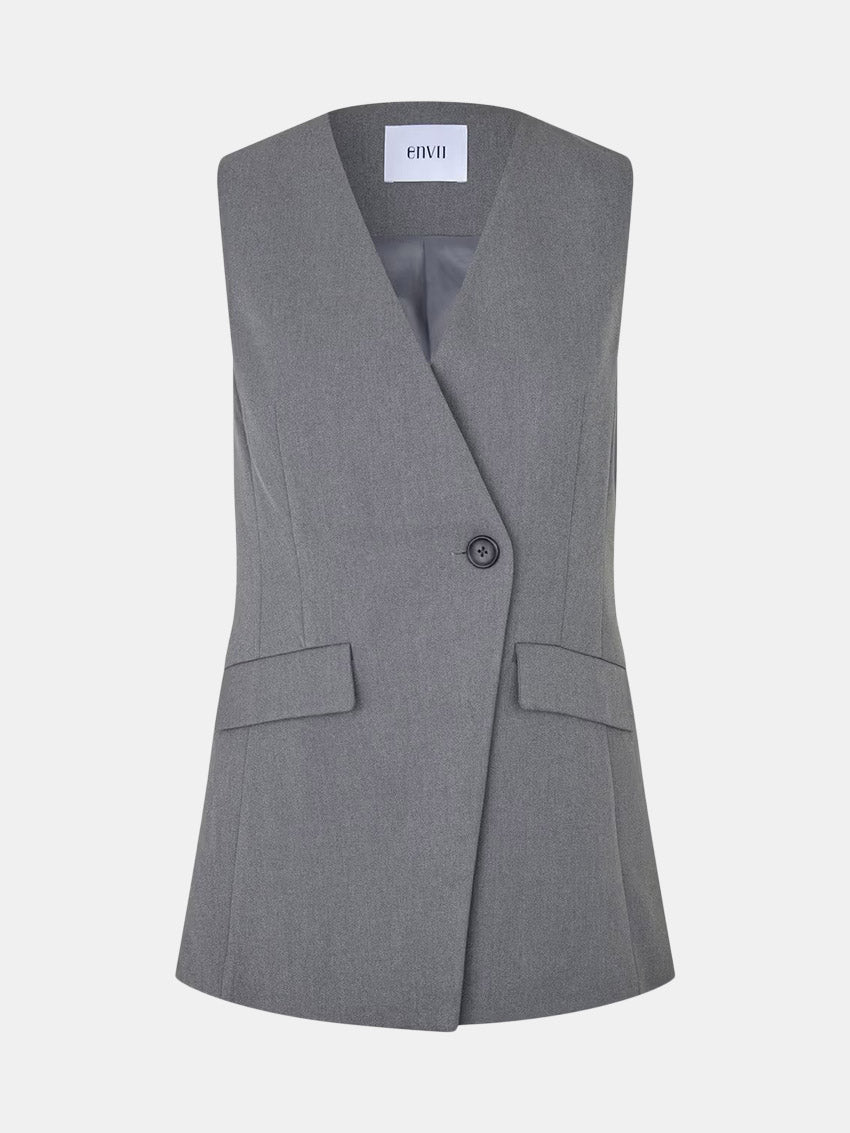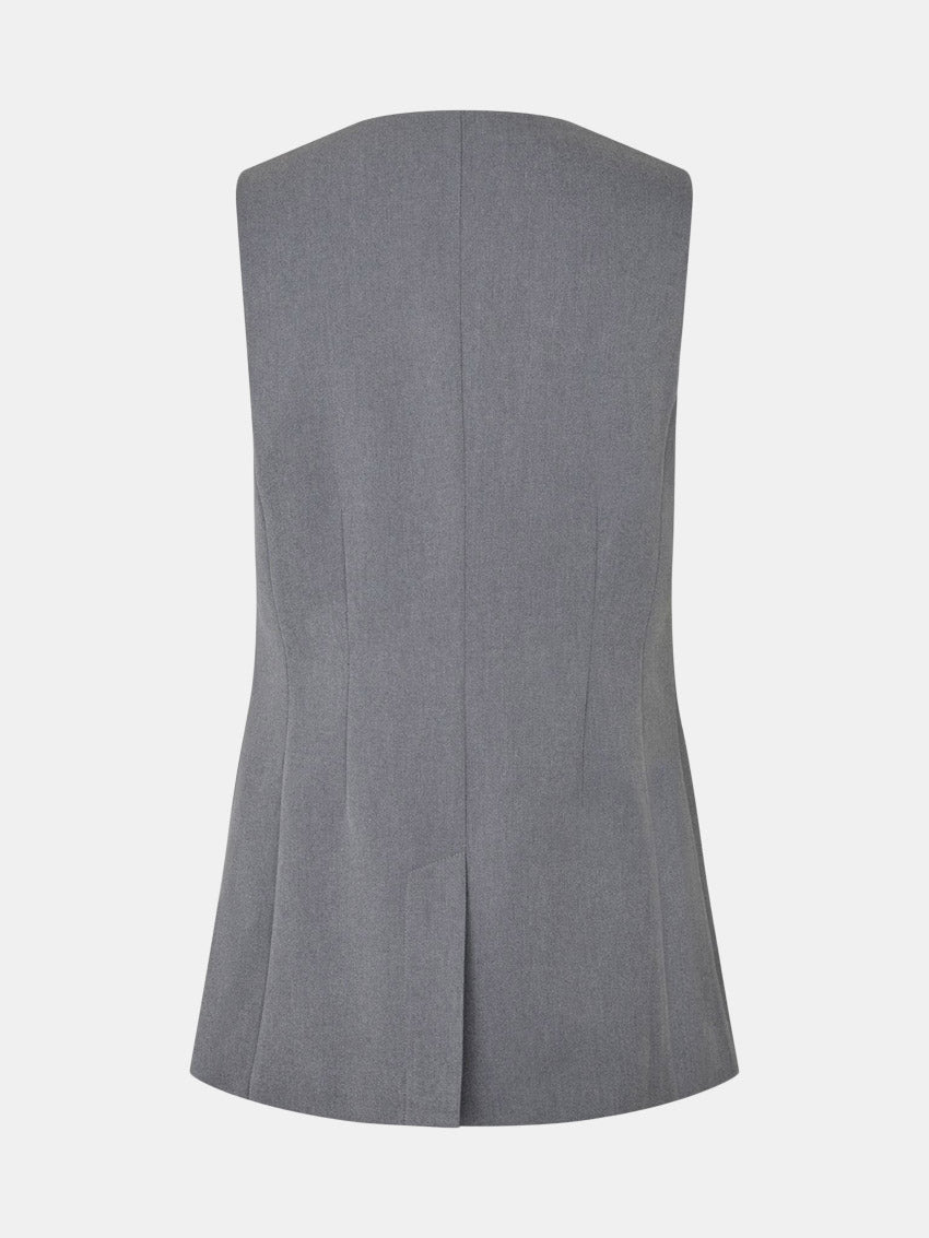 Skræddersyet vest med normal pasform og et suiting-inspireret udtryk. Designet har enkel knaplukning med asymmetrisk slå-om, V-udskæring samt slids forneden bagpå. To klaplommer foran og fuldt foer giver et gennemført og elegant finish.