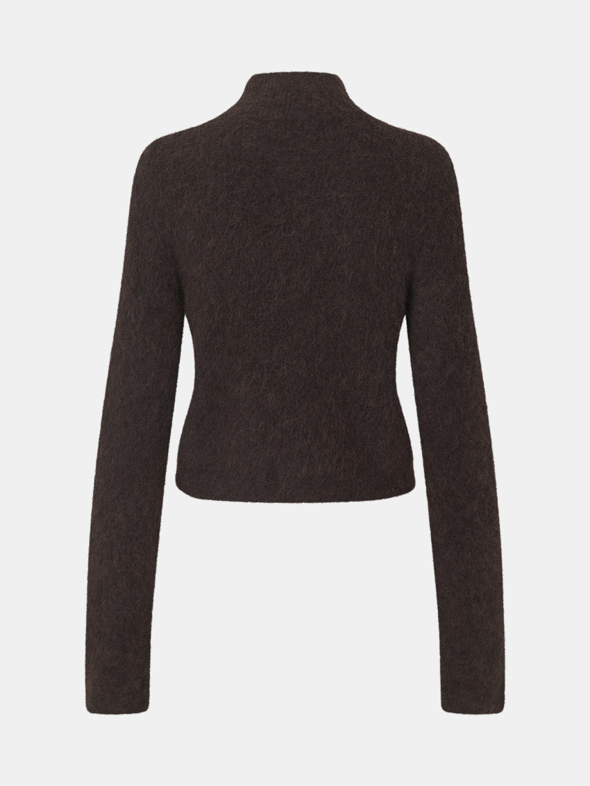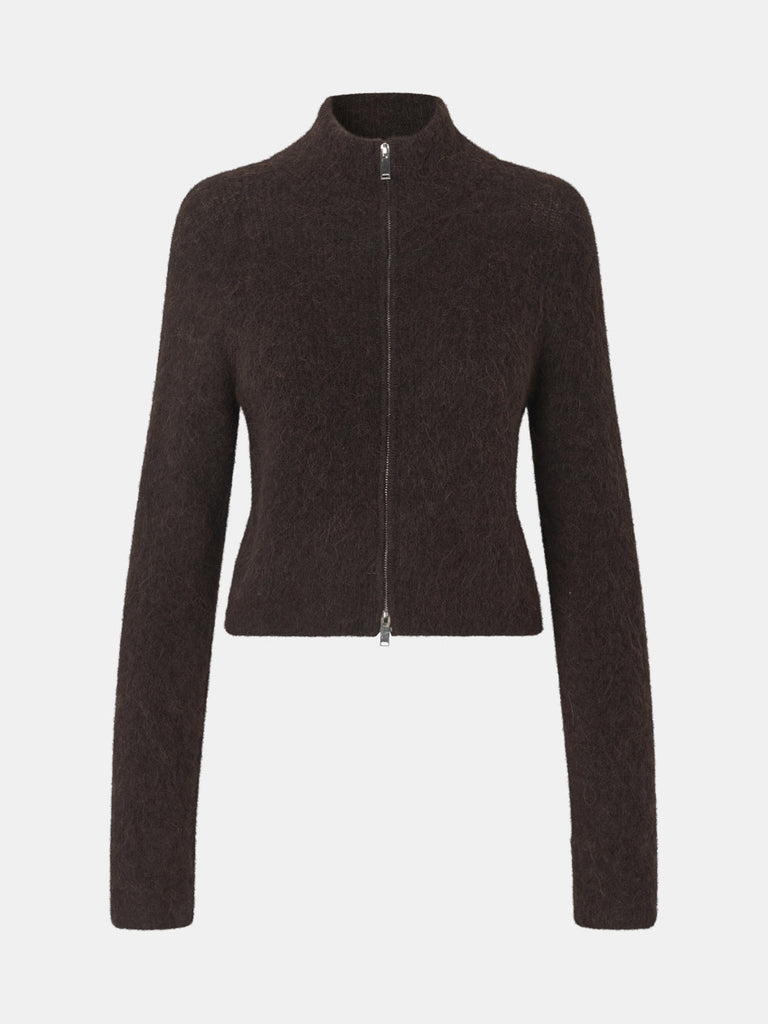 Mørkebrun cardigan med let fluffy struktur og tovejslynlås fra Envii.