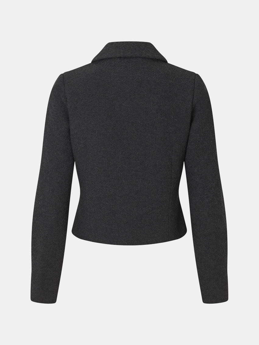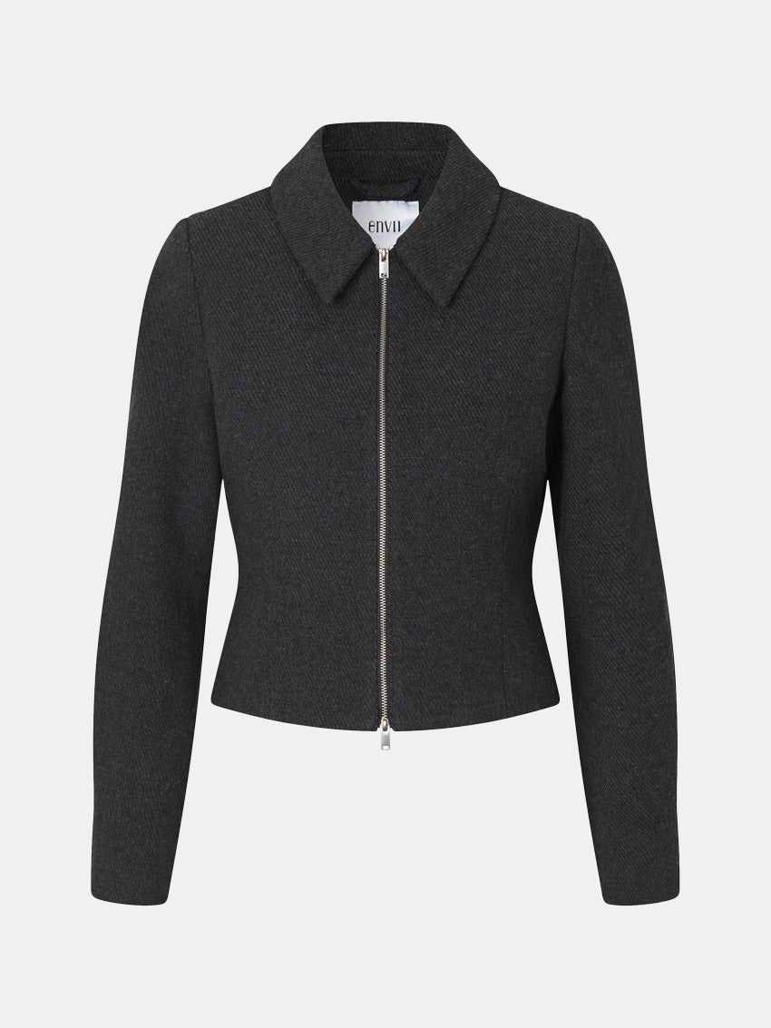 Kort blazer i en blød uldblanding med diskret sildebensmønster og tovejs lynlås fra Envii. Kan styles med matchende bukser